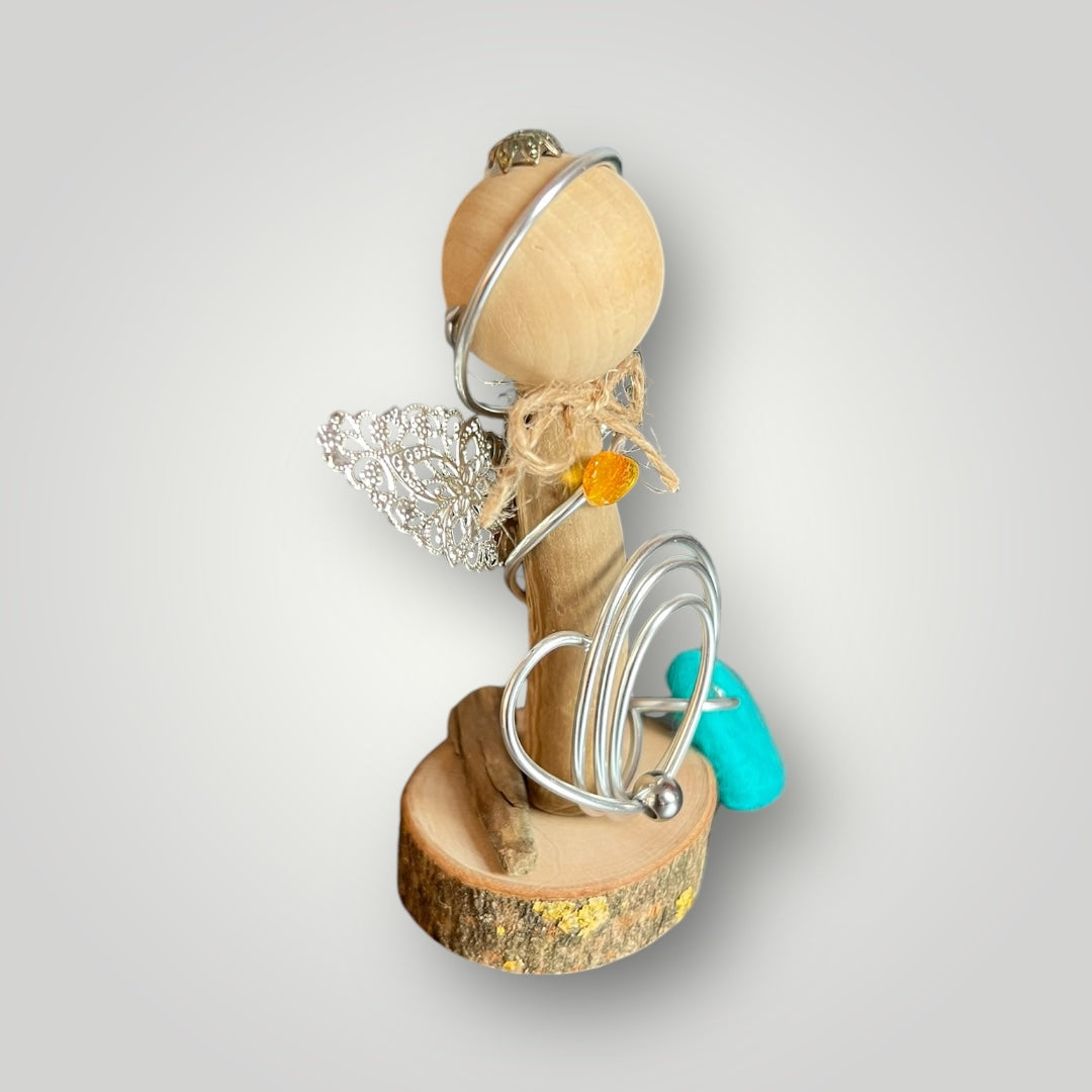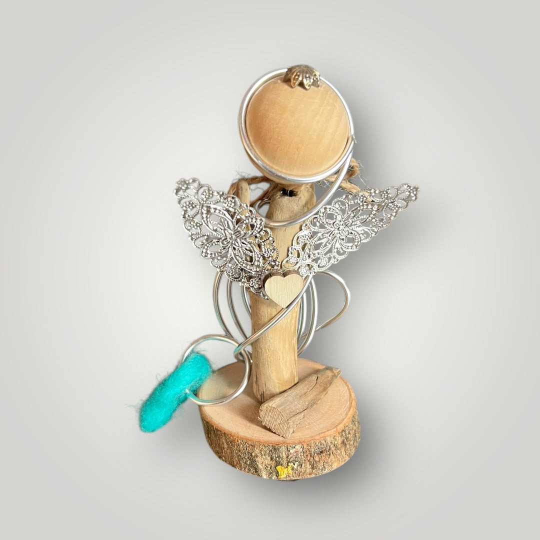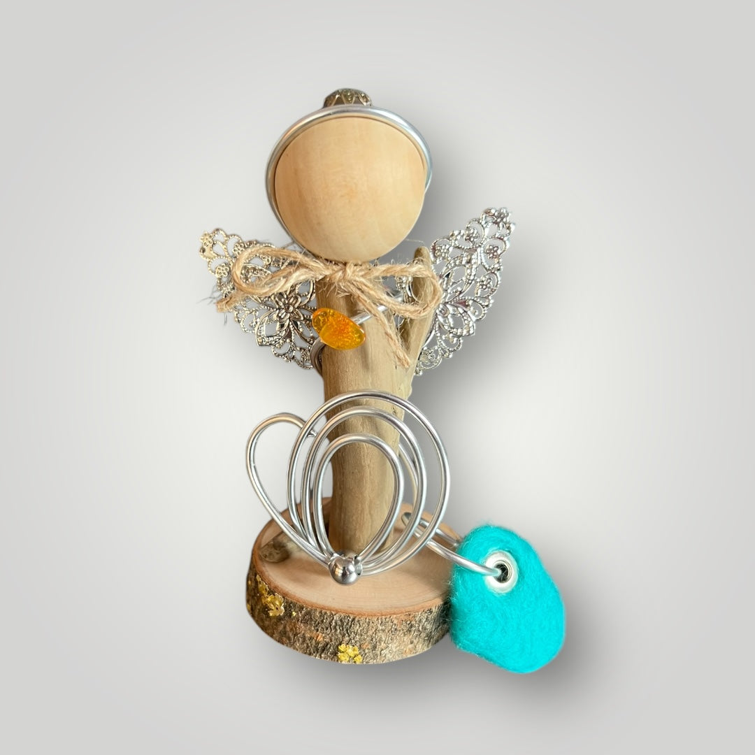 Dieser liebevoll handgefertigte Auto-Engel begleitet dich sicher auf all deinen Fahrten. Jeder Engel wird aus natürlichen Materialien wie Holz, Metall und Treibholz individuell gestaltet, wodurch jeder ein Unikat ist. Die filigranen Flügel aus Metall und der elegant umrahmte Körper aus dekorativem Draht verleihen ihm eine besondere Ausstrahlung. Das Treibholz verleiht jedem Engel einen rustikalen und einzigartigen Charme. Ein kleines Herz oder Stern aus Filz bringt eine persönliche, farbenfrohe Note. Der Engel kann entweder hängend im Auto verwendet werden oder stehend auf einer ebenen Fläche platziert werden.