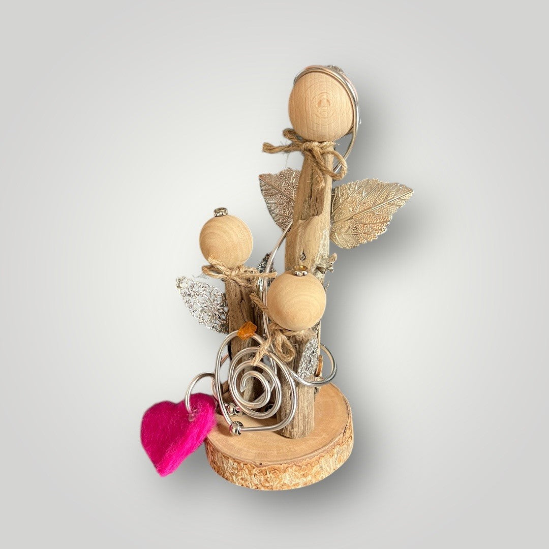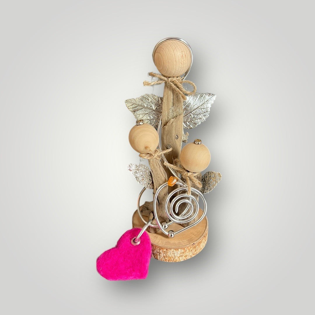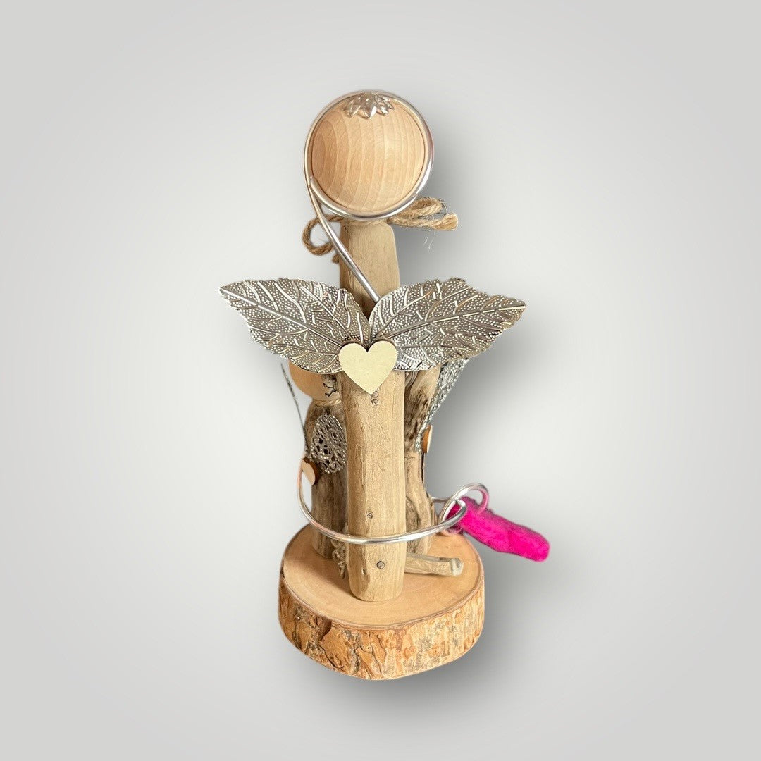 Dieser liebevoll handgefertigte Engel bringt Glück und positive Energie in dein Zuhause. Jeder Engel wird aus natürlichen Materialien wie Holz, Metall und Treibholz individuell gestaltet, wodurch jeder ein Unikat ist. Die Flügel bestehen aus filigranem Metall, und der Körper wird durch dekorativen Draht elegant umrahmt. Das Treibholz verleiht dem Engel einen rustikalen und einzigartigen Charme. Ein kleines Herz, Stern oder Kleeblatt in verschiedenen Farben aus Filz sorgt für eine farbenfrohe, persönliche Note. Die Engel stehen auf einer stabilen Holzscheibe und eignen sich ideal als Deko-Element für Regale, Tische oder Fensterbänke.