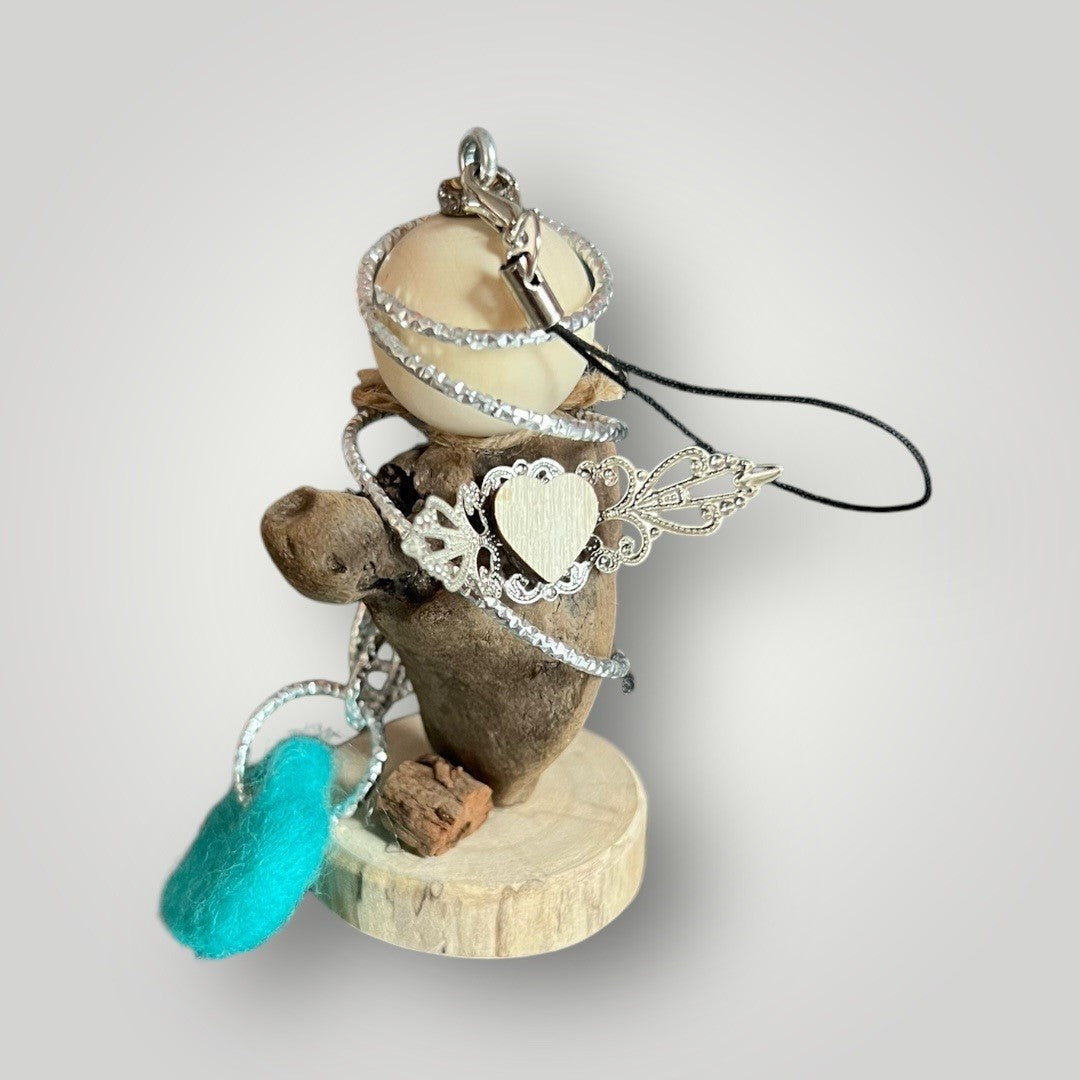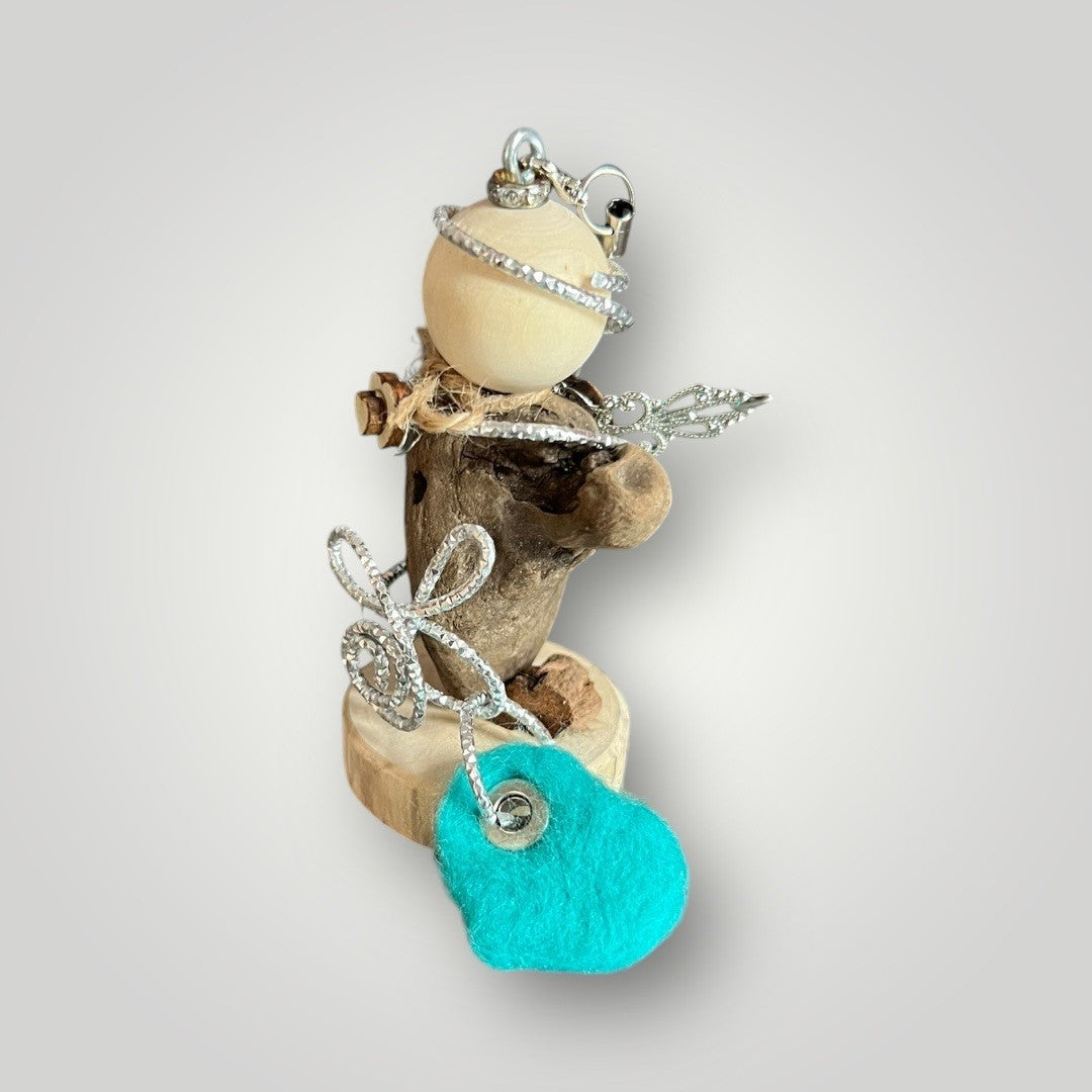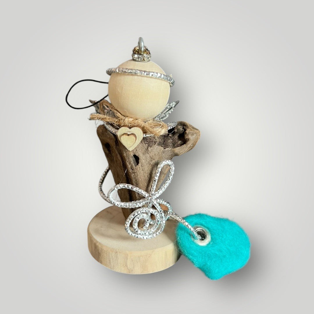 Dieser liebevoll handgefertigte Auto-Engel begleitet dich sicher auf all deinen Fahrten. Jeder Engel wird aus natürlichen Materialien wie Holz, Metall und Treibholz individuell gestaltet, wodurch jeder ein Unikat ist. Die filigranen Flügel aus Metall und der elegant umrahmte Körper aus dekorativem Draht verleihen ihm eine besondere Ausstrahlung. Das Treibholz verleiht jedem Engel einen rustikalen und einzigartigen Charme. Ein kleines Herz oder Stern aus Filz bringt eine persönliche, farbenfrohe Note. Der Engel kann entweder hängend im Auto verwendet werden oder stehend auf einer ebenen Fläche platziert werden.