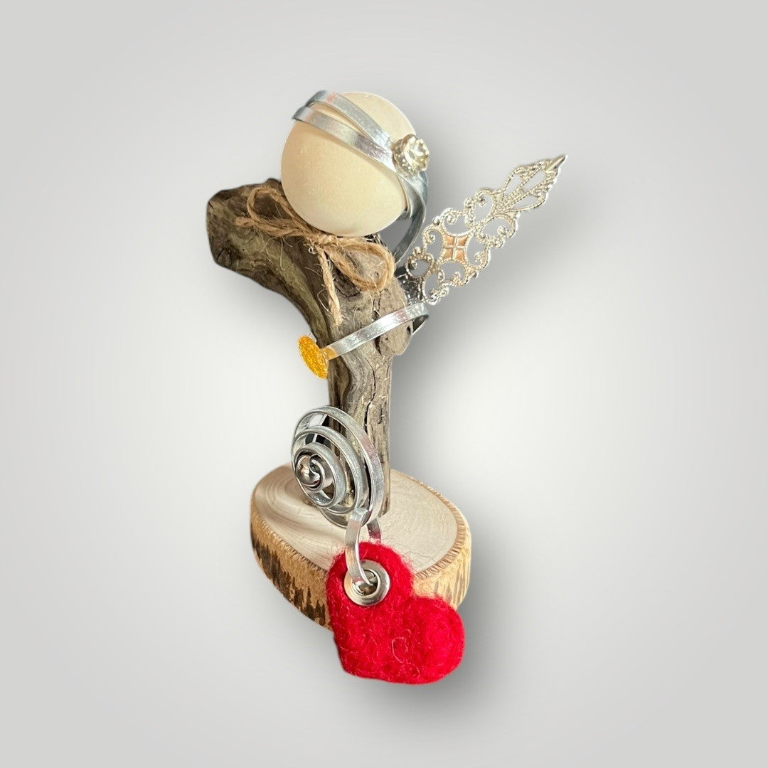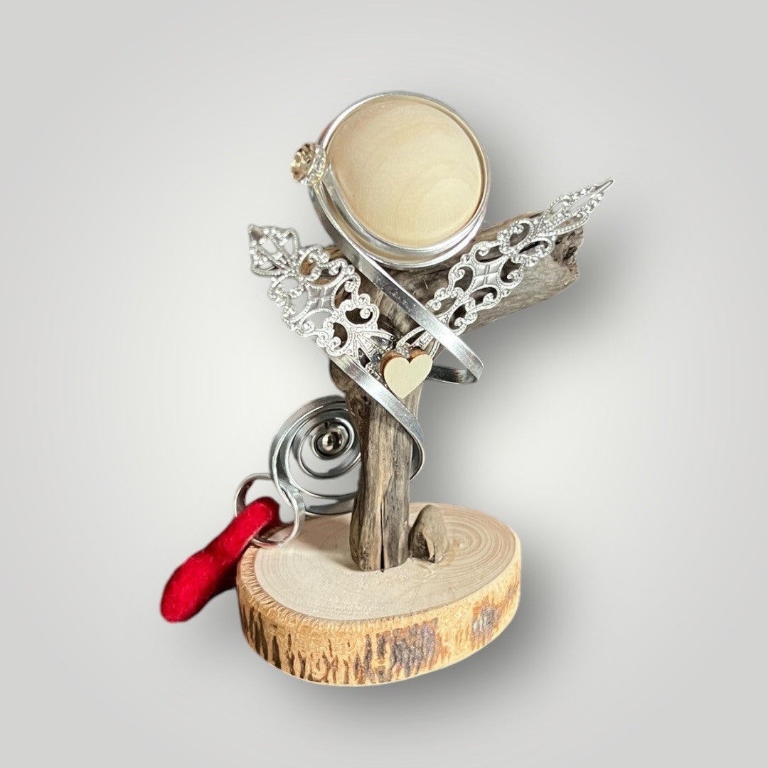 Dieser liebevoll handgefertigte Auto-Engel begleitet dich sicher auf all deinen Fahrten. Jeder Engel wird aus natürlichen Materialien wie Holz, Metall und Treibholz individuell gestaltet, wodurch jeder ein Unikat ist. Die filigranen Flügel aus Metall und der elegant umrahmte Körper aus dekorativem Draht verleihen ihm eine besondere Ausstrahlung. Das Treibholz verleiht jedem Engel einen rustikalen und einzigartigen Charme. Ein kleines Herz oder Stern aus Filz bringt eine persönliche, farbenfrohe Note. Der Engel kann entweder hängend im Auto verwendet werden oder stehend auf einer ebenen Fläche platziert werden.
