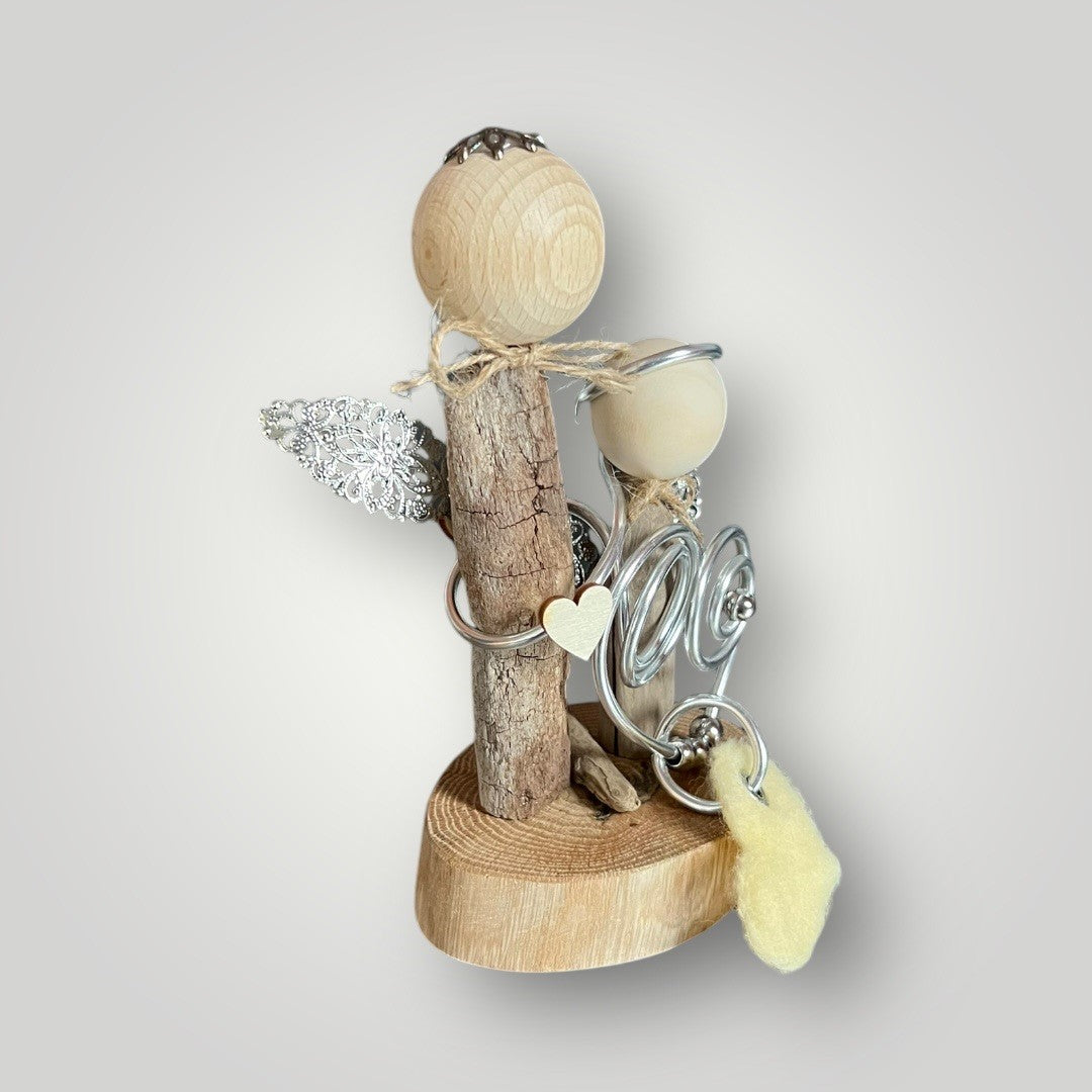 Dieser liebevoll handgefertigte Engel bringt Glück und positive Energie in dein Zuhause. Jeder Engel wird aus natürlichen Materialien wie Holz, Metall und Treibholz individuell gestaltet, wodurch jeder ein Unikat ist. Die Flügel bestehen aus filigranem Metall, und der Körper wird durch dekorativen Draht elegant umrahmt. Das Treibholz verleiht dem Engel einen rustikalen und einzigartigen Charme. Ein kleines Herz, Stern oder Kleeblatt in verschiedenen Farben aus Filz sorgt für eine farbenfrohe, persönliche Note. Die Engel stehen auf einer stabilen Holzscheibe und eignen sich ideal als Deko-Element für Regale, Tische oder Fensterbänke.
