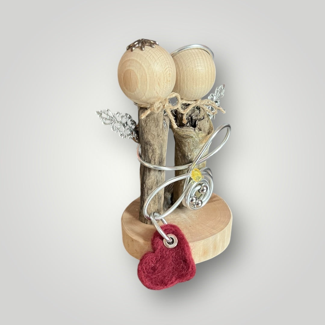 Dieser liebevoll handgefertigte Engel bringt Glück und positive Energie in dein Zuhause. Jeder Engel wird aus natürlichen Materialien wie Holz, Metall und Treibholz individuell gestaltet, wodurch jeder ein Unikat ist. Die Flügel bestehen aus filigranem Metall, und der Körper wird durch dekorativen Draht elegant umrahmt. Das Treibholz verleiht dem Engel einen rustikalen und einzigartigen Charme. Ein kleines Herz, Stern oder Kleeblatt in verschiedenen Farben aus Filz sorgt für eine farbenfrohe, persönliche Note. Die Engel stehen auf einer stabilen Holzscheibe und eignen sich ideal als Deko-Element für Regale, Tische oder Fensterbänke.