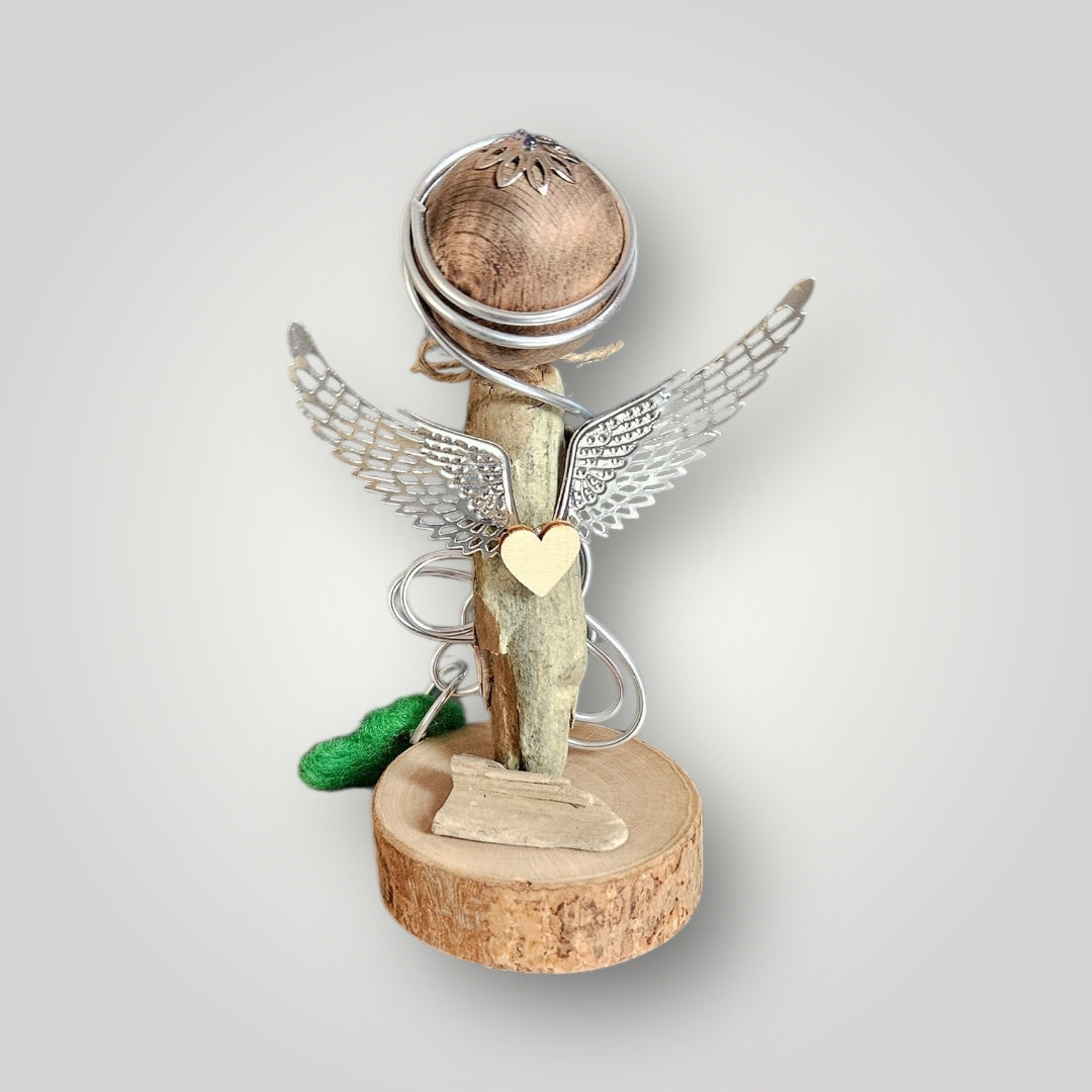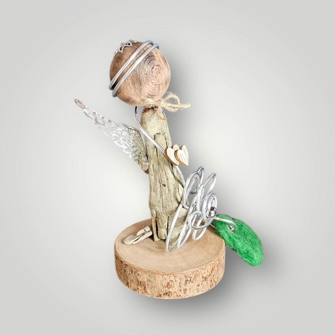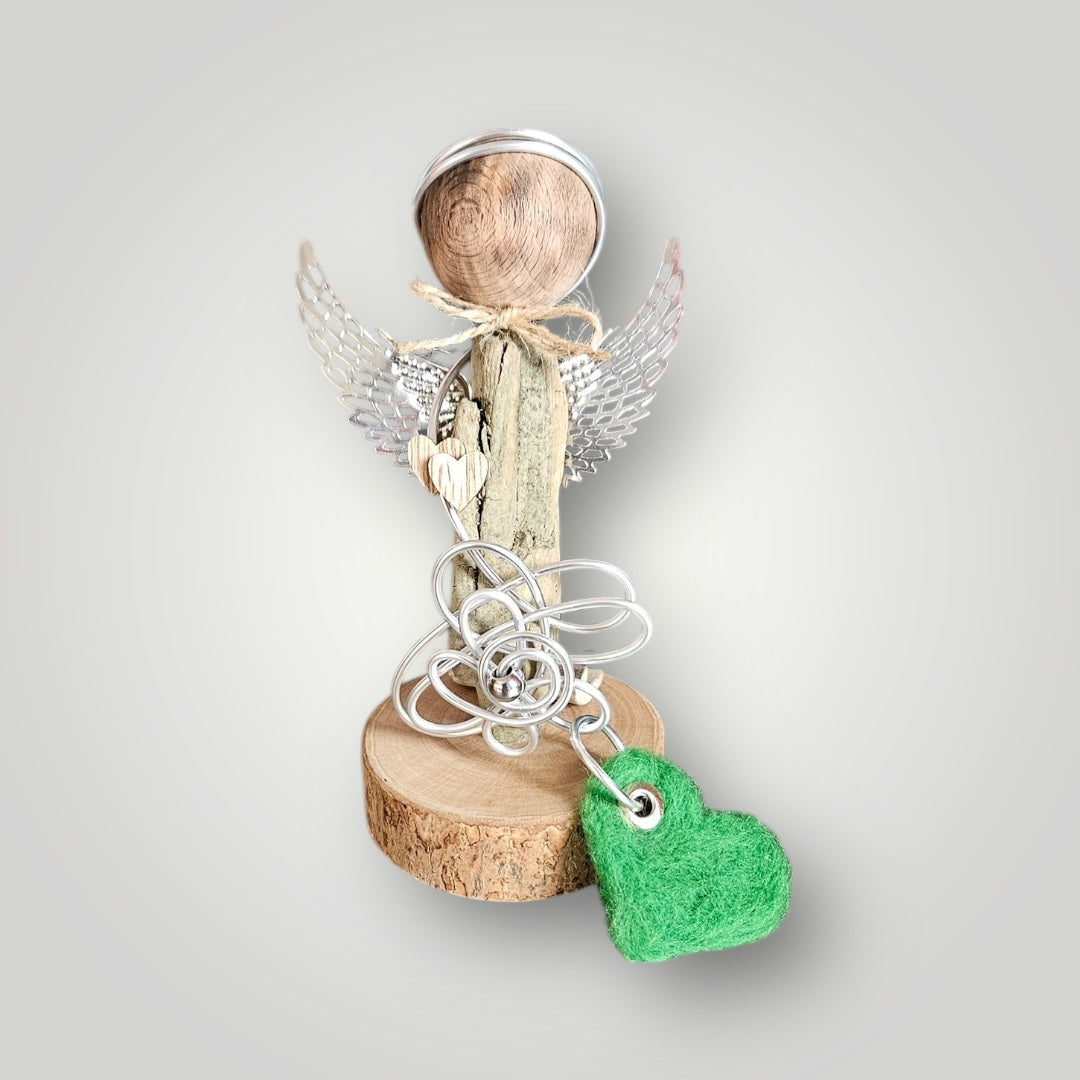 Dieser liebevoll handgefertigte Engel bringt Glück und positive Energie in dein Zuhause. Jeder Engel wird aus natürlichen Materialien wie Holz, Metall und Treibholz individuell gestaltet, wodurch jeder ein Unikat ist. Die Flügel bestehen aus filigranem Metall, und der Körper wird durch dekorativen Draht elegant umrahmt. Das Treibholz verleiht dem Engel einen rustikalen und einzigartigen Charme. Ein kleines Herz, Stern oder Kleeblatt in verschiedenen Farben aus Filz sorgt für eine farbenfrohe, persönliche Note. Die Engel stehen auf einer stabilen Holzscheibe und eignen sich ideal als Deko-Element für Regale, Tische oder Fensterbänke.
