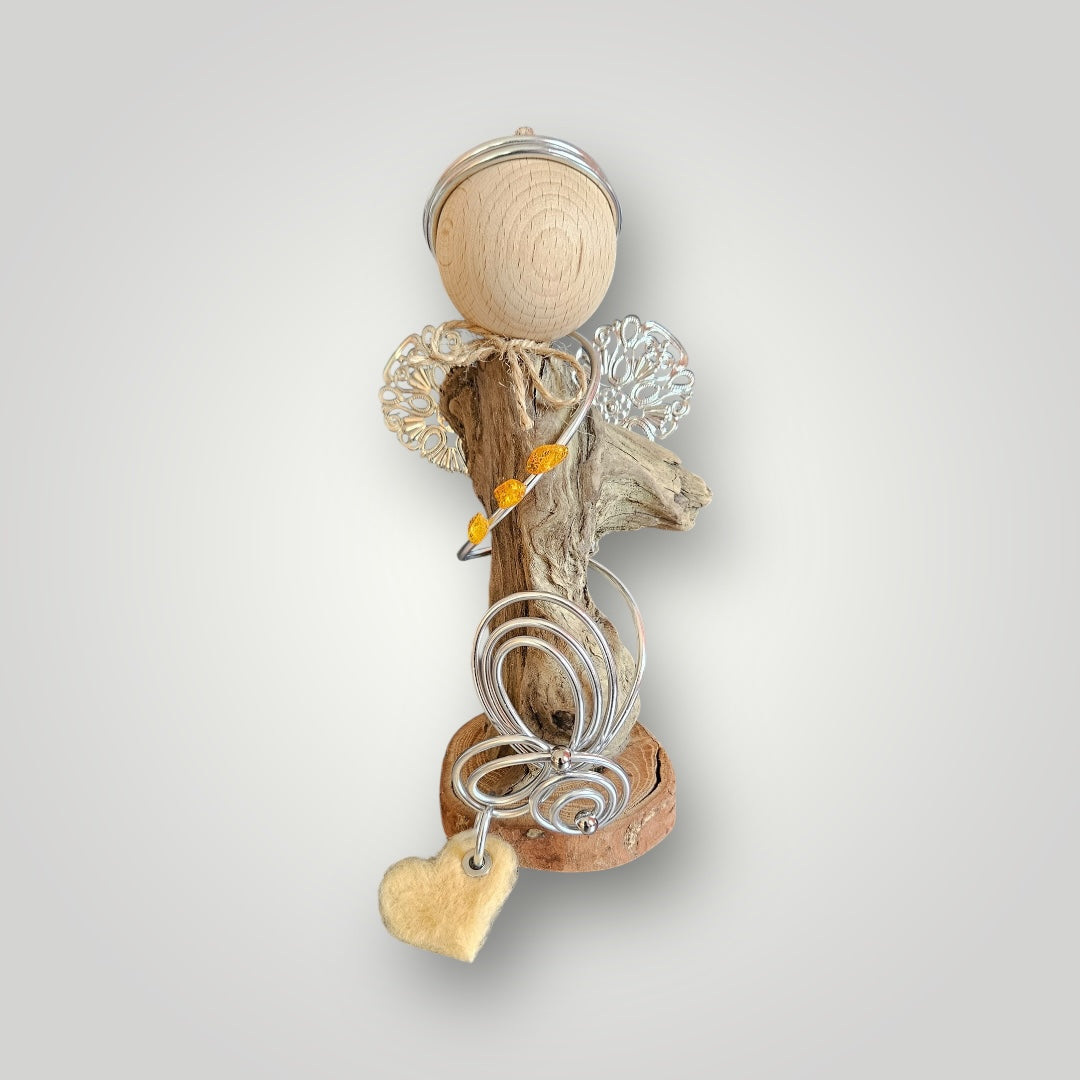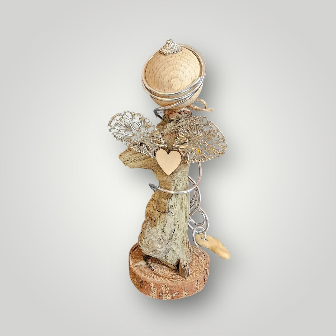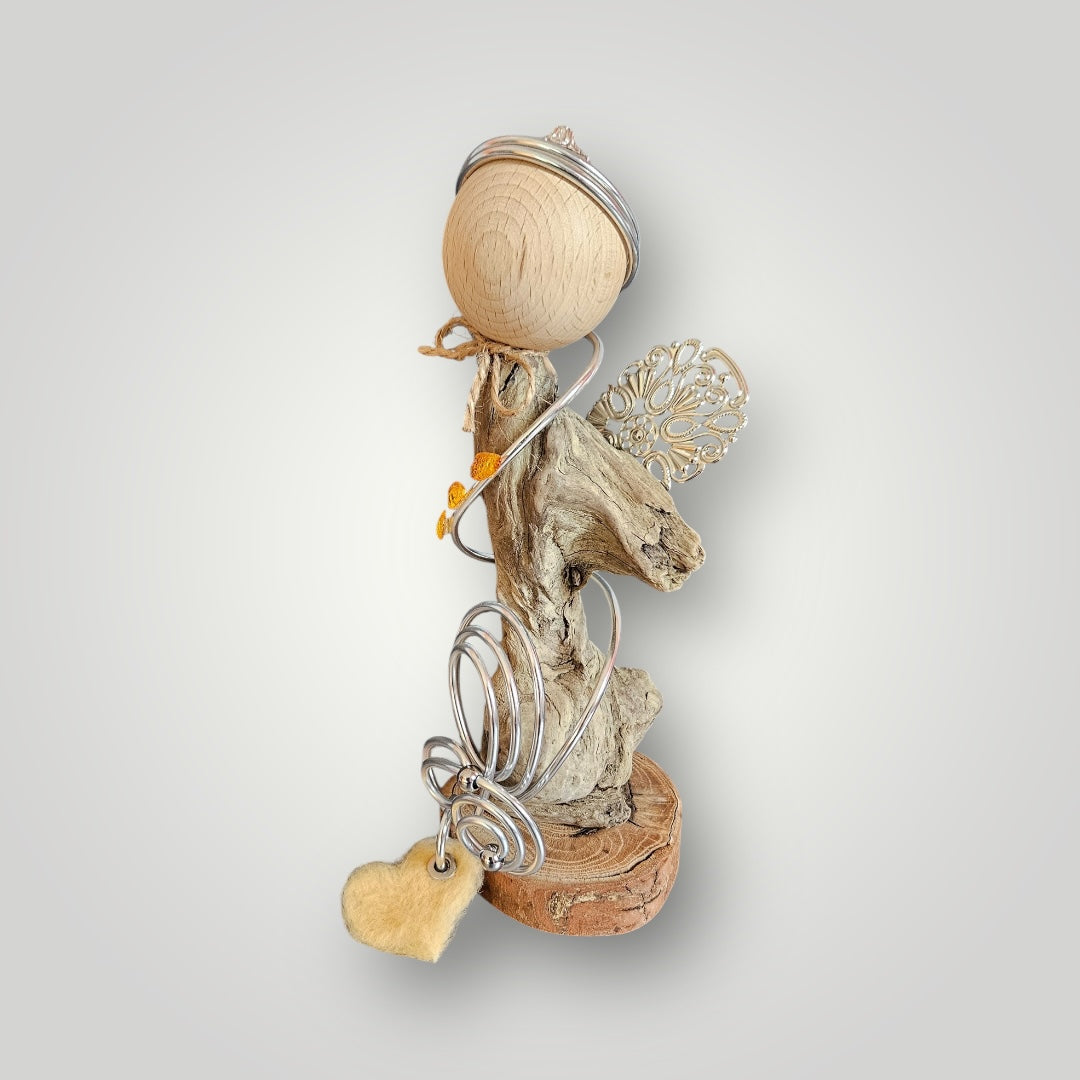 Dieser liebevoll handgefertigte Engel bringt Glück und positive Energie in dein Zuhause. Jeder Engel wird aus natürlichen Materialien wie Holz, Metall und Treibholz individuell gestaltet, wodurch jeder ein Unikat ist. Die Flügel bestehen aus filigranem Metall, und der Körper wird durch dekorativen Draht elegant umrahmt. Das Treibholz verleiht dem Engel einen rustikalen und einzigartigen Charme. Ein kleines Herz, Stern oder Kleeblatt in verschiedenen Farben aus Filz sorgt für eine farbenfrohe, persönliche Note. Die Engel stehen auf einer stabilen Holzscheibe und eignen sich ideal als Deko-Element für Regale, Tische oder Fensterbänke.