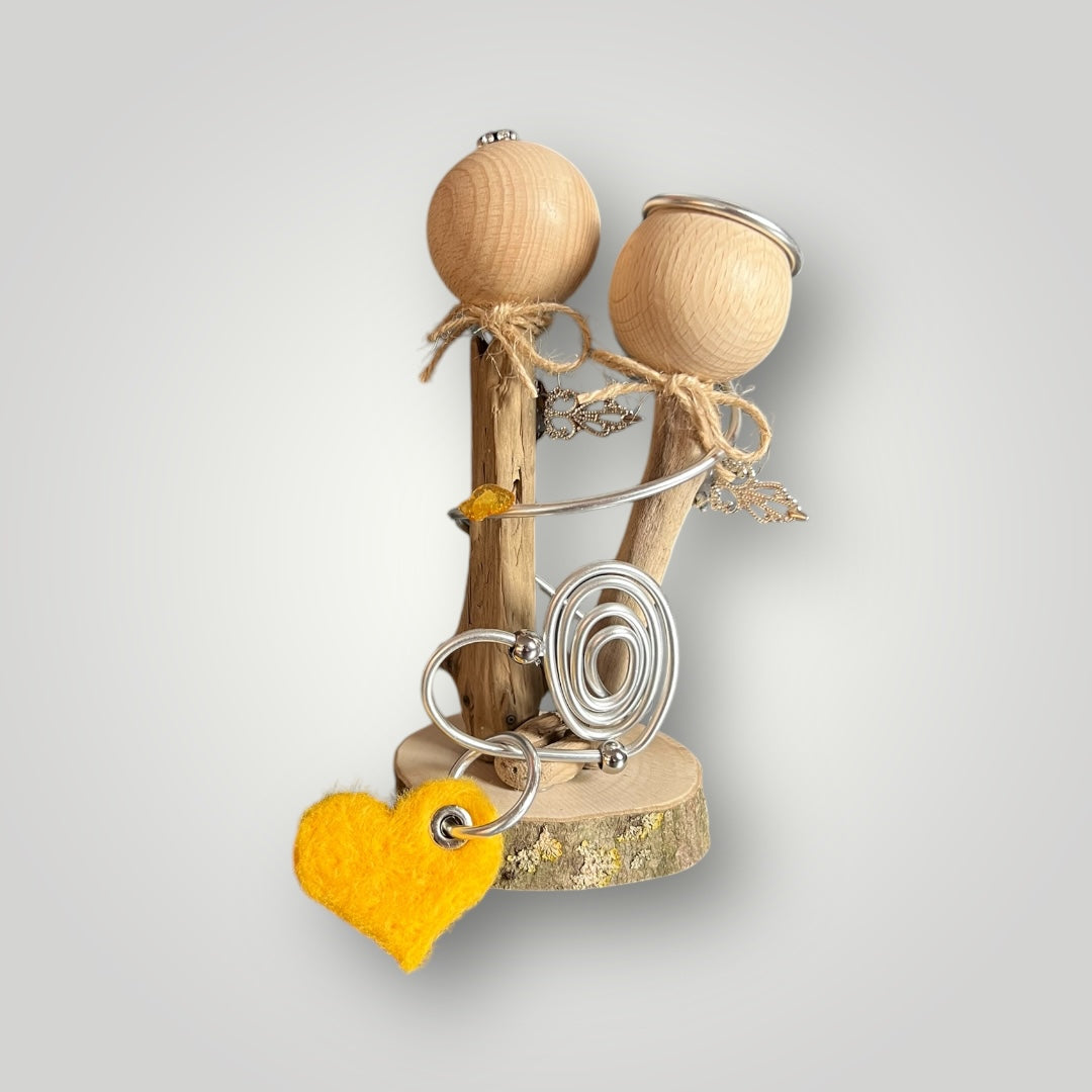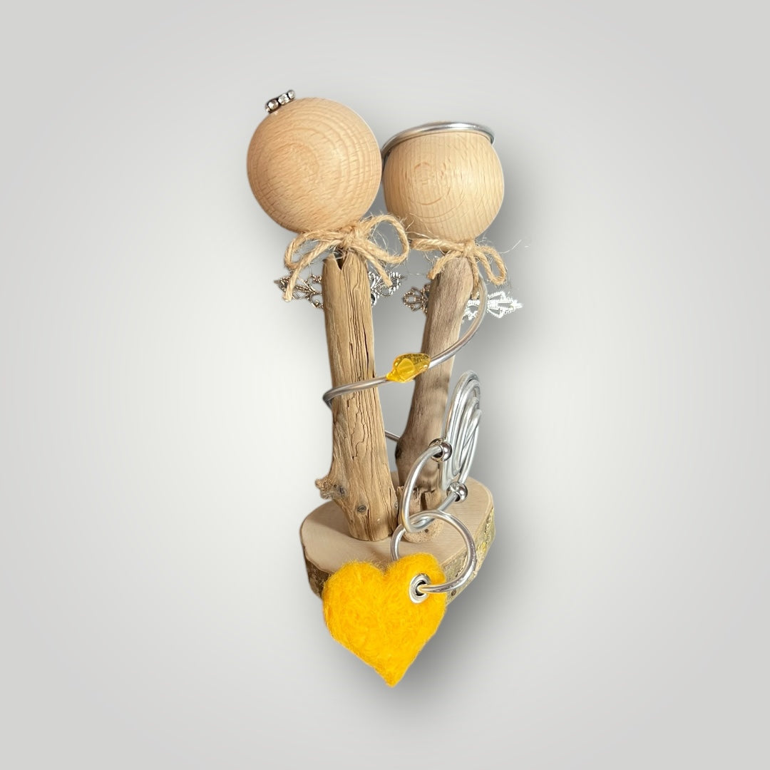 Dieser liebevoll handgefertigte Engel bringt Glück und positive Energie in dein Zuhause. Jeder Engel wird aus natürlichen Materialien wie Holz, Metall und Treibholz individuell gestaltet, wodurch jeder ein Unikat ist. Die Flügel bestehen aus filigranem Metall, und der Körper wird durch dekorativen Draht elegant umrahmt. Das Treibholz verleiht dem Engel einen rustikalen und einzigartigen Charme. Ein kleines Herz, Stern oder Kleeblatt in verschiedenen Farben aus Filz sorgt für eine farbenfrohe, persönliche Note. Die Engel stehen auf einer stabilen Holzscheibe und eignen sich ideal als Deko-Element für Regale, Tische oder Fensterbänke.