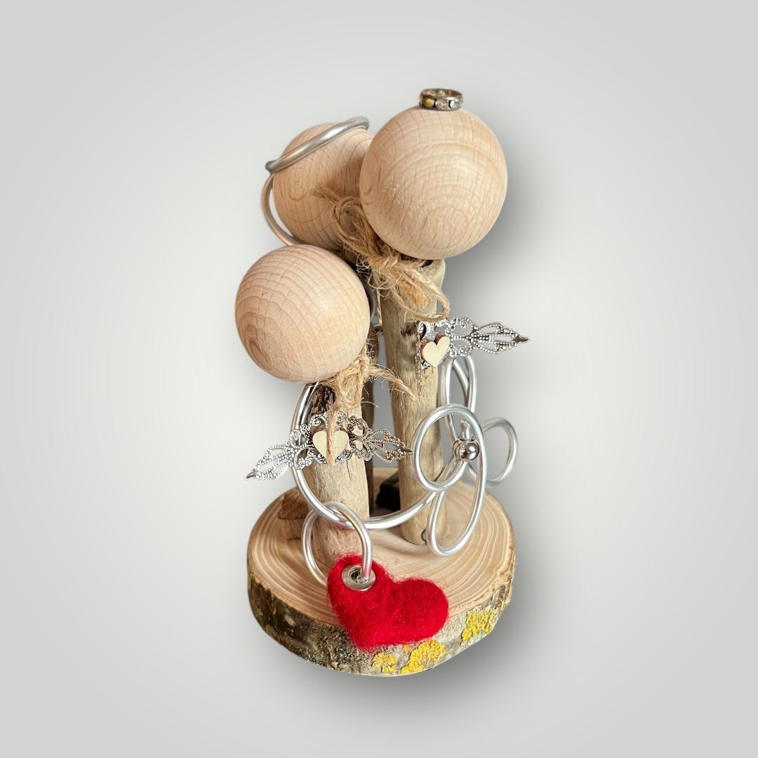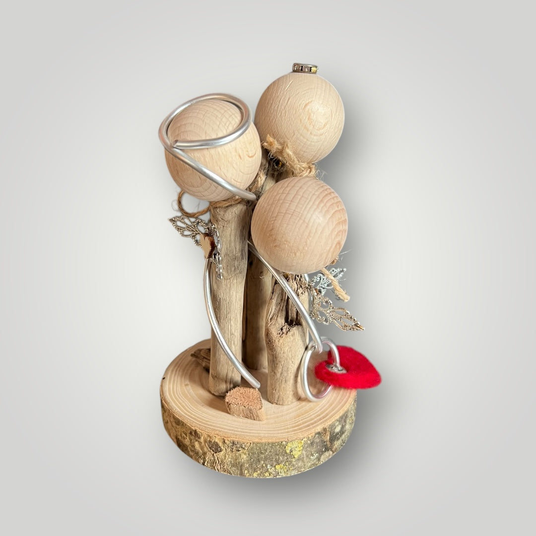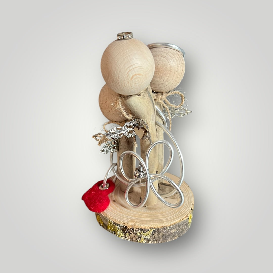 Dieser liebevoll handgefertigte Engel bringt Glück und positive Energie in dein Zuhause. Jeder Engel wird aus natürlichen Materialien wie Holz, Metall und Treibholz individuell gestaltet, wodurch jeder ein Unikat ist. Die Flügel bestehen aus filigranem Metall, und der Körper wird durch dekorativen Draht elegant umrahmt. Das Treibholz verleiht dem Engel einen rustikalen und einzigartigen Charme. Ein kleines Herz, Stern oder Kleeblatt in verschiedenen Farben aus Filz sorgt für eine farbenfrohe, persönliche Note. Die Engel stehen auf einer stabilen Holzscheibe und eignen sich ideal als Deko-Element für Regale, Tische oder Fensterbänke.