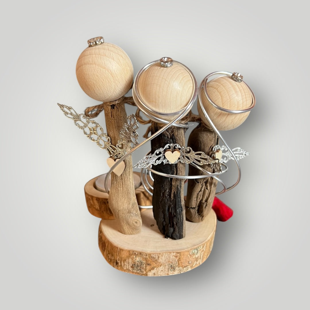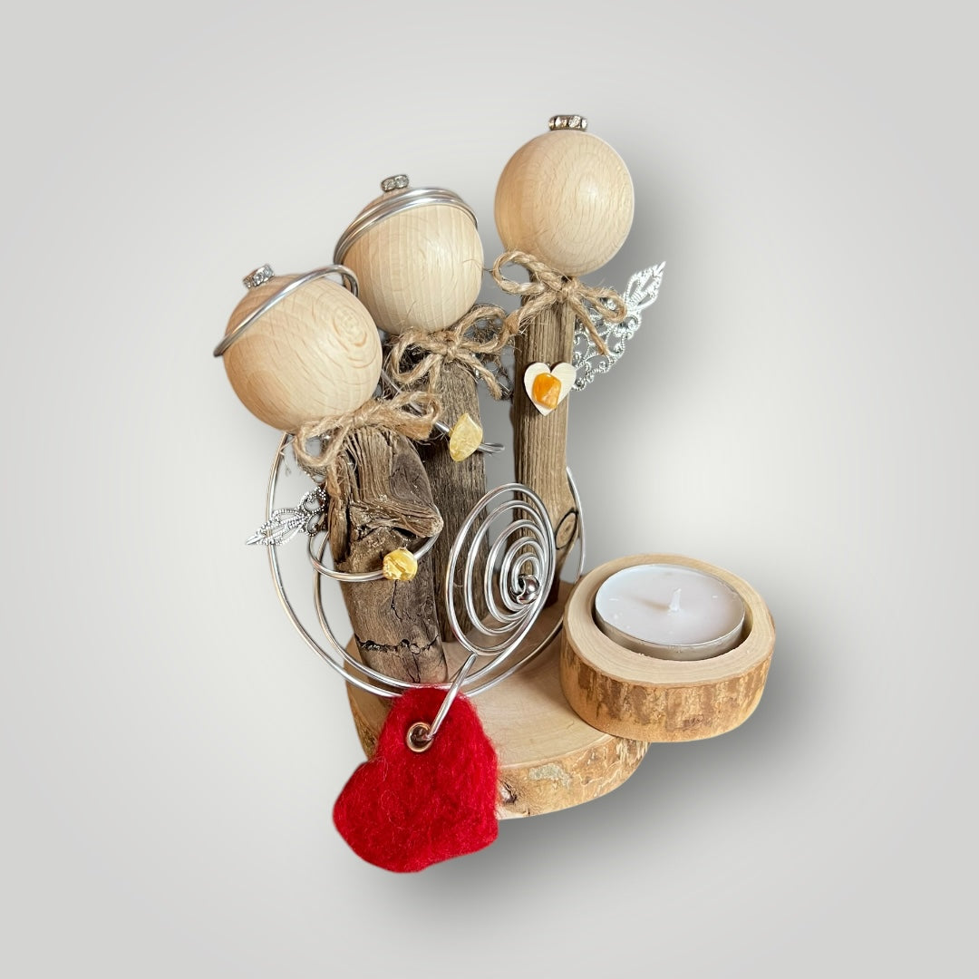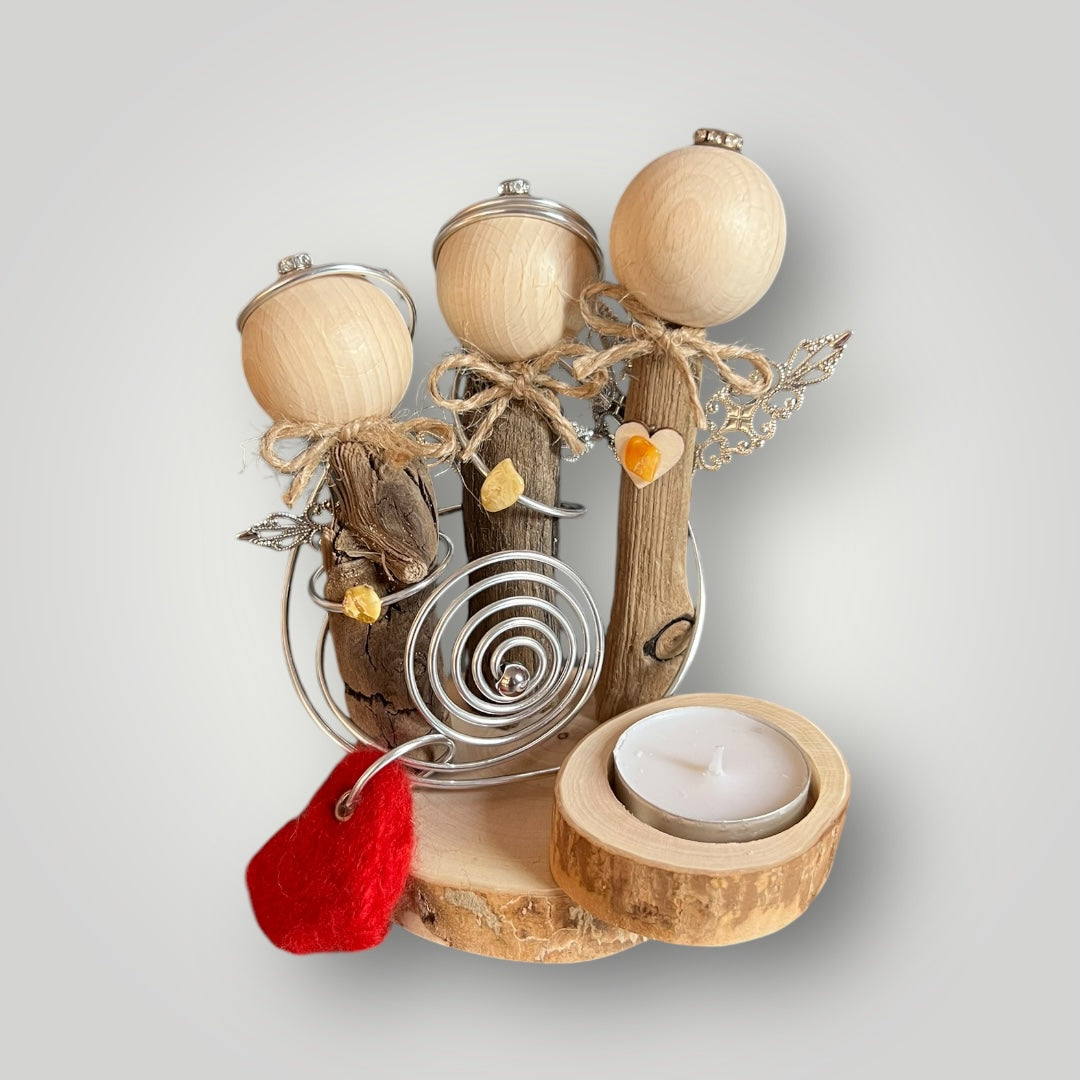 Dieser liebevoll handgefertigte Engel bringt Glück und positive Energie in dein Zuhause. Jeder Engel wird aus natürlichen Materialien wie Holz, Metall und Treibholz individuell gestaltet, wodurch jeder ein Unikat ist. Die Flügel bestehen aus filigranem Metall, und der Körper wird durch dekorativen Draht elegant umrahmt. Das Treibholz verleiht dem Engel einen rustikalen und einzigartigen Charme. Ein kleines Herz, Stern oder Kleeblatt in verschiedenen Farben aus Filz sorgt für eine farbenfrohe, persönliche Note. Die Engel stehen auf einer stabilen Holzscheibe und eignen sich ideal als Deko-Element für Regale, Tische oder Fensterbänke.