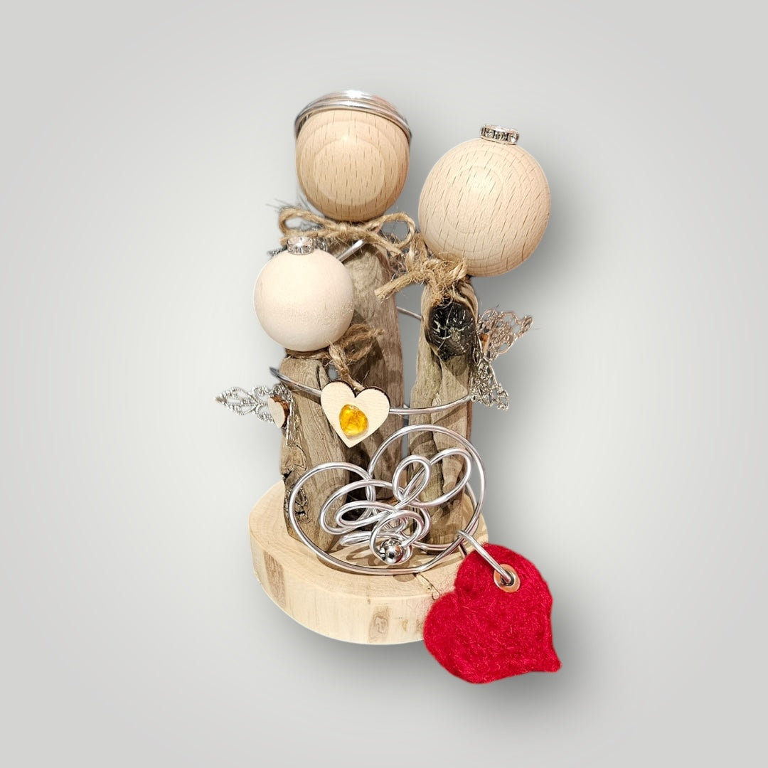 Dieser liebevoll handgefertigte Engel bringt Glück und positive Energie in dein Zuhause. Jeder Engel wird aus natürlichen Materialien wie Holz, Metall und Treibholz individuell gestaltet, wodurch jeder ein Unikat ist. Die Flügel bestehen aus filigranem Metall, und der Körper wird durch dekorativen Draht elegant umrahmt. Das Treibholz verleiht dem Engel einen rustikalen und einzigartigen Charme. Ein kleines Herz, Stern oder Kleeblatt in verschiedenen Farben aus Filz sorgt für eine farbenfrohe, persönliche Note. Die Engel stehen auf einer stabilen Holzscheibe und eignen sich ideal als Deko-Element für Regale, Tische oder Fensterbänke.