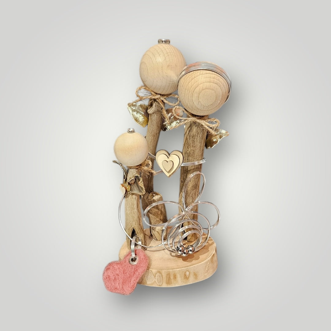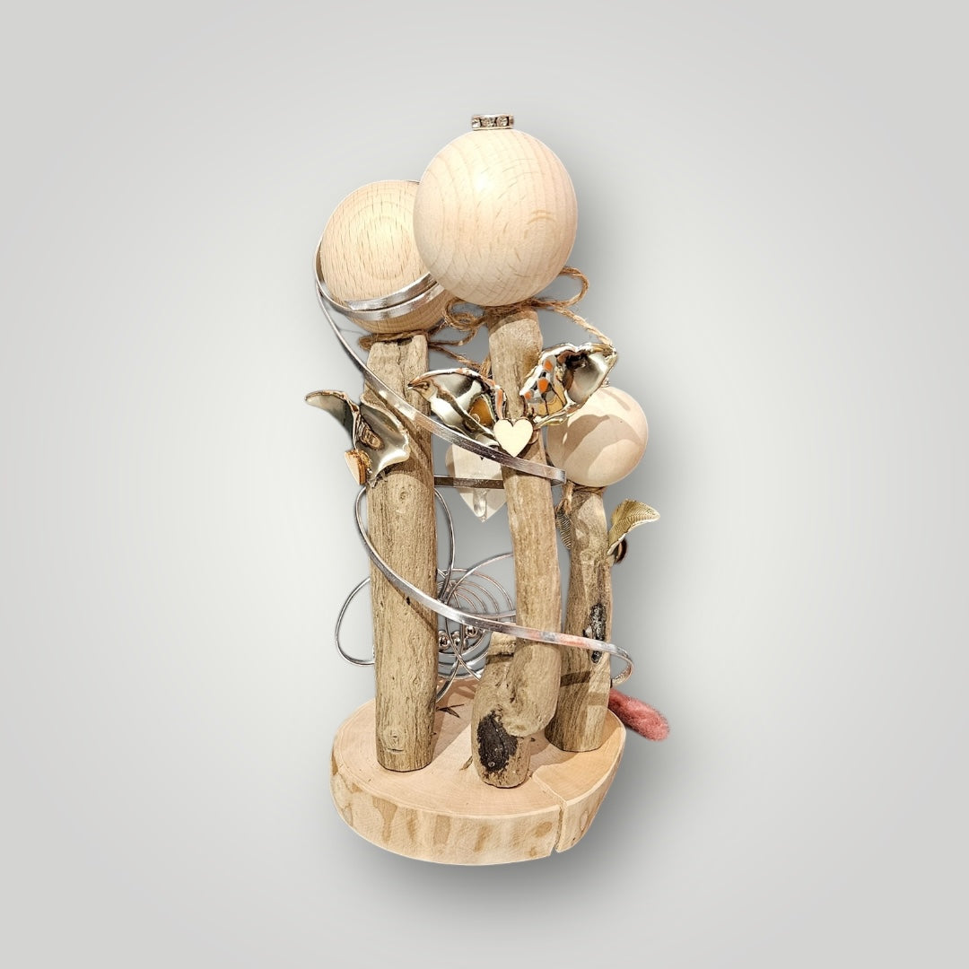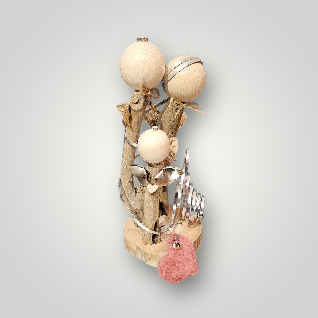 Dieser liebevoll handgefertigte Engel bringt Glück und positive Energie in dein Zuhause. Jeder Engel wird aus natürlichen Materialien wie Holz, Metall und Treibholz individuell gestaltet, wodurch jeder ein Unikat ist. Die Flügel bestehen aus filigranem Metall, und der Körper wird durch dekorativen Draht elegant umrahmt. Das Treibholz verleiht dem Engel einen rustikalen und einzigartigen Charme. Ein kleines Herz, Stern oder Kleeblatt in verschiedenen Farben aus Filz sorgt für eine farbenfrohe, persönliche Note. Die Engel stehen auf einer stabilen Holzscheibe und eignen sich ideal als Deko-Element für Regale, Tische oder Fensterbänke.