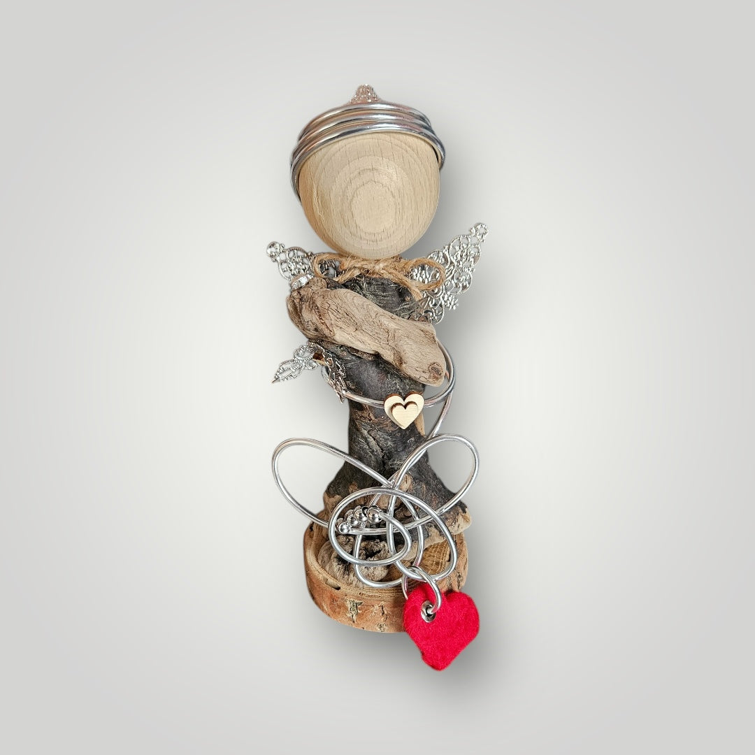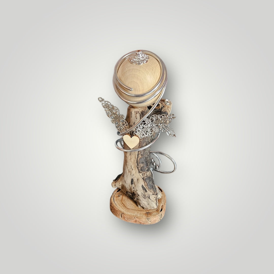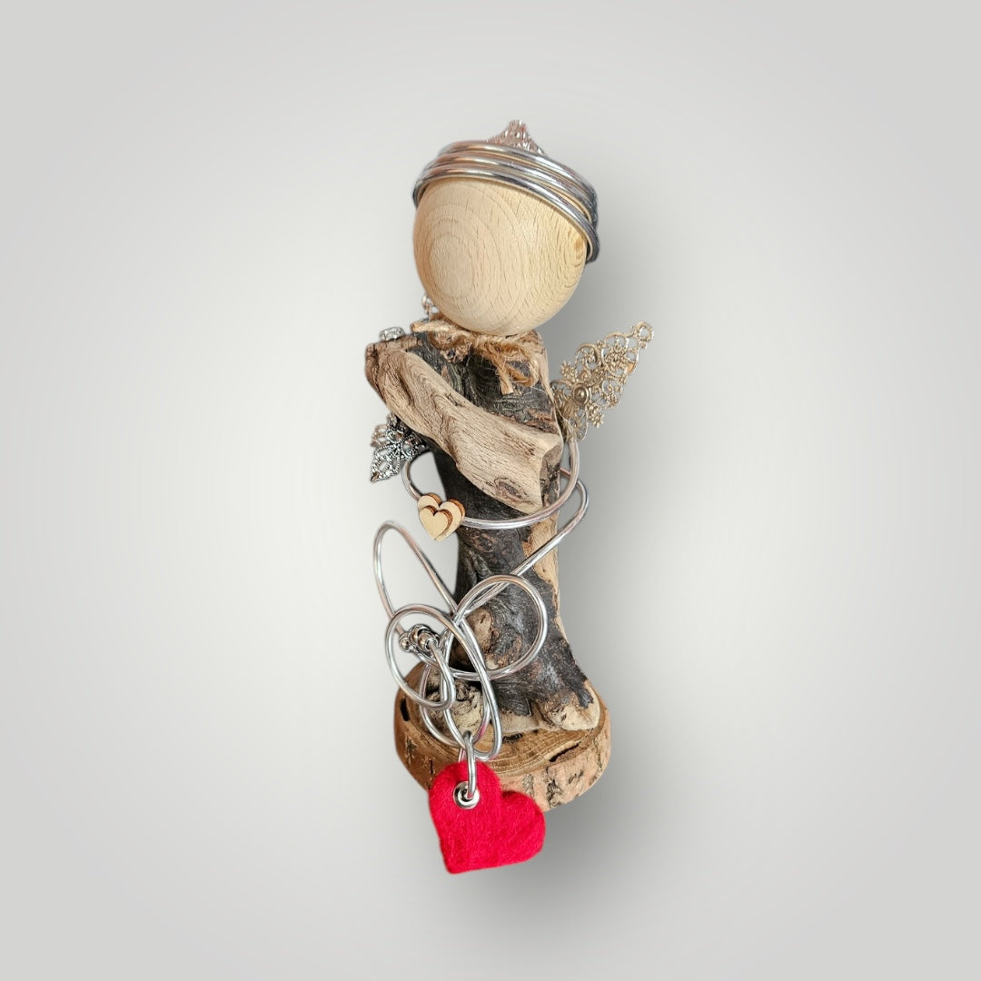 Dieser liebevoll handgefertigte Engel bringt Glück und positive Energie in dein Zuhause. Jeder Engel wird aus natürlichen Materialien wie Holz, Metall und Treibholz individuell gestaltet, wodurch jeder ein Unikat ist. Die Flügel bestehen aus filigranem Metall, und der Körper wird durch dekorativen Draht elegant umrahmt. Das Treibholz verleiht dem Engel einen rustikalen und einzigartigen Charme. Ein kleines Herz, Stern oder Kleeblatt in verschiedenen Farben aus Filz sorgt für eine farbenfrohe, persönliche Note. Die Engel stehen auf einer stabilen Holzscheibe und eignen sich ideal als Deko-Element für Regale, Tische oder Fensterbänke.