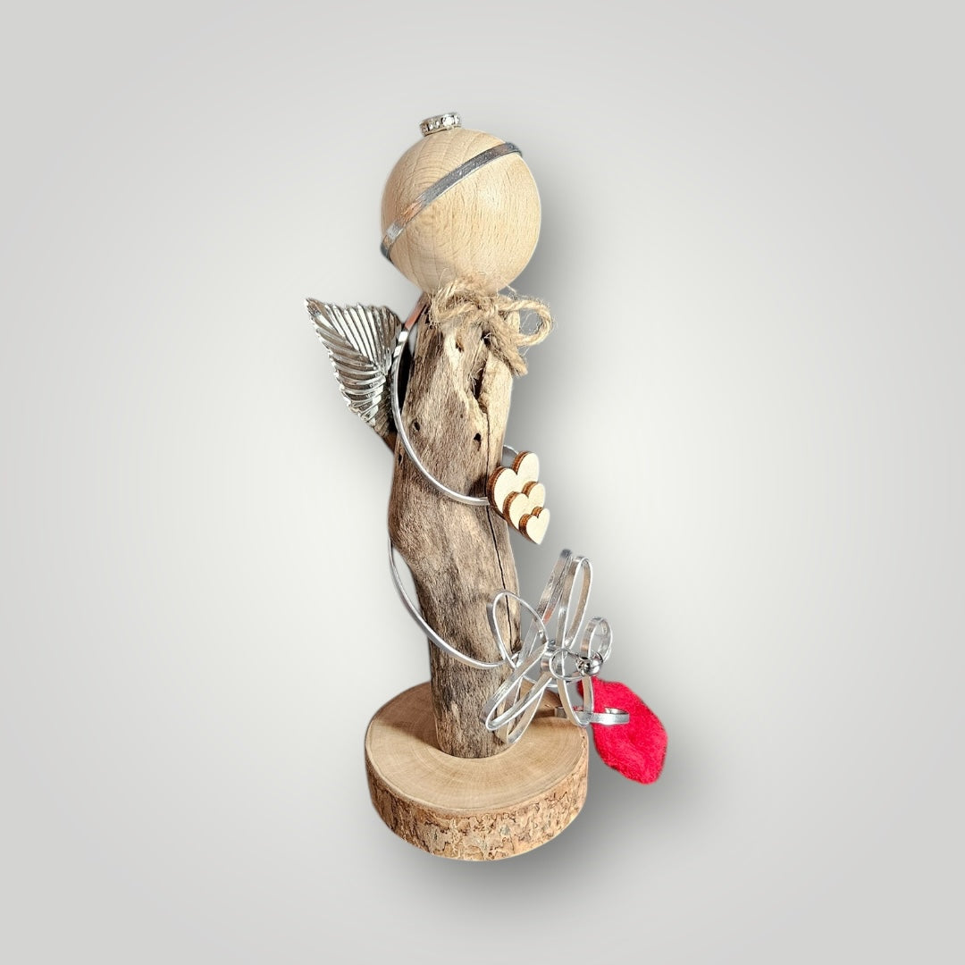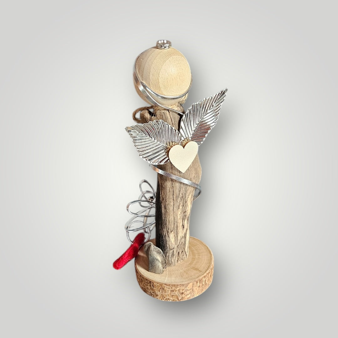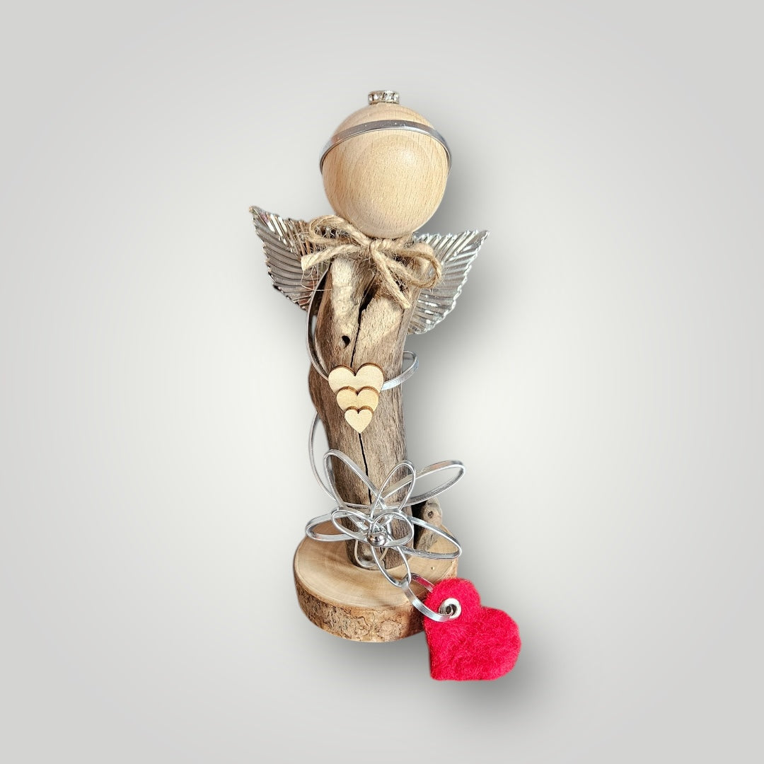 Dieser liebevoll handgefertigte Engel bringt Glück und positive Energie in dein Zuhause. Jeder Engel wird aus natürlichen Materialien wie Holz, Metall und Treibholz individuell gestaltet, wodurch jeder ein Unikat ist. Die Flügel bestehen aus filigranem Metall, und der Körper wird durch dekorativen Draht elegant umrahmt. Das Treibholz verleiht dem Engel einen rustikalen und einzigartigen Charme. Ein kleines Herz, Stern oder Kleeblatt in verschiedenen Farben aus Filz sorgt für eine farbenfrohe, persönliche Note. Die Engel stehen auf einer stabilen Holzscheibe und eignen sich ideal als Deko-Element für Regale, Tische oder Fensterbänke.