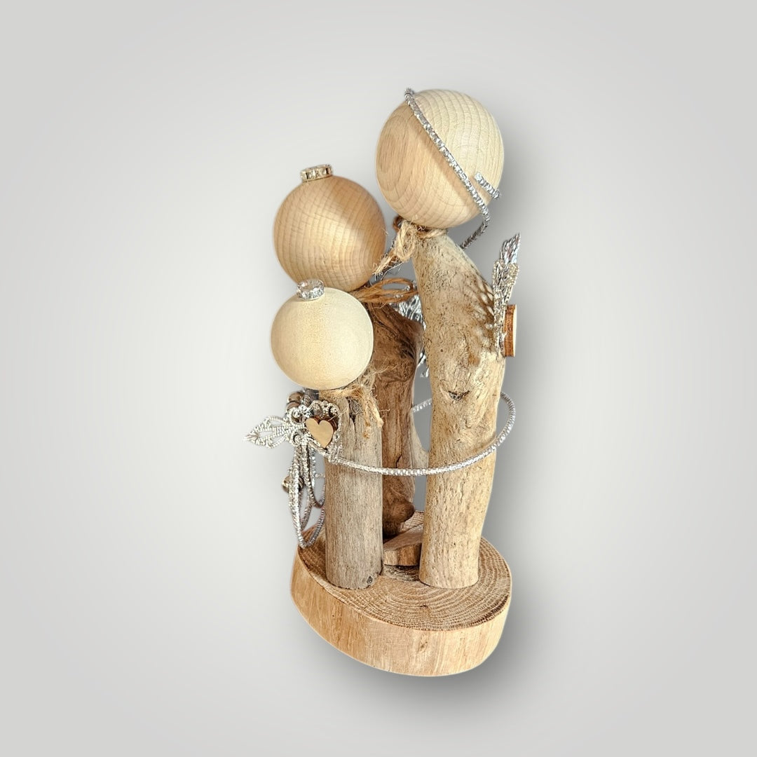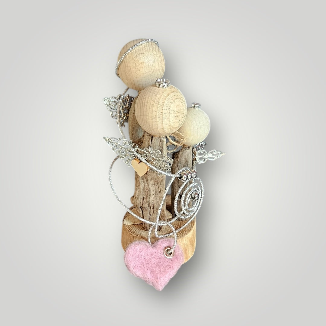 Dieser liebevoll handgefertigte Engel bringt Glück und positive Energie in dein Zuhause. Jeder Engel wird aus natürlichen Materialien wie Holz, Metall und Treibholz individuell gestaltet, wodurch jeder ein Unikat ist. Die Flügel bestehen aus filigranem Metall, und der Körper wird durch dekorativen Draht elegant umrahmt. Das Treibholz verleiht dem Engel einen rustikalen und einzigartigen Charme. Ein kleines Herz, Stern oder Kleeblatt in verschiedenen Farben aus Filz sorgt für eine farbenfrohe, persönliche Note. Die Engel stehen auf einer stabilen Holzscheibe und eignen sich ideal als Deko-Element für Regale, Tische oder Fensterbänke.