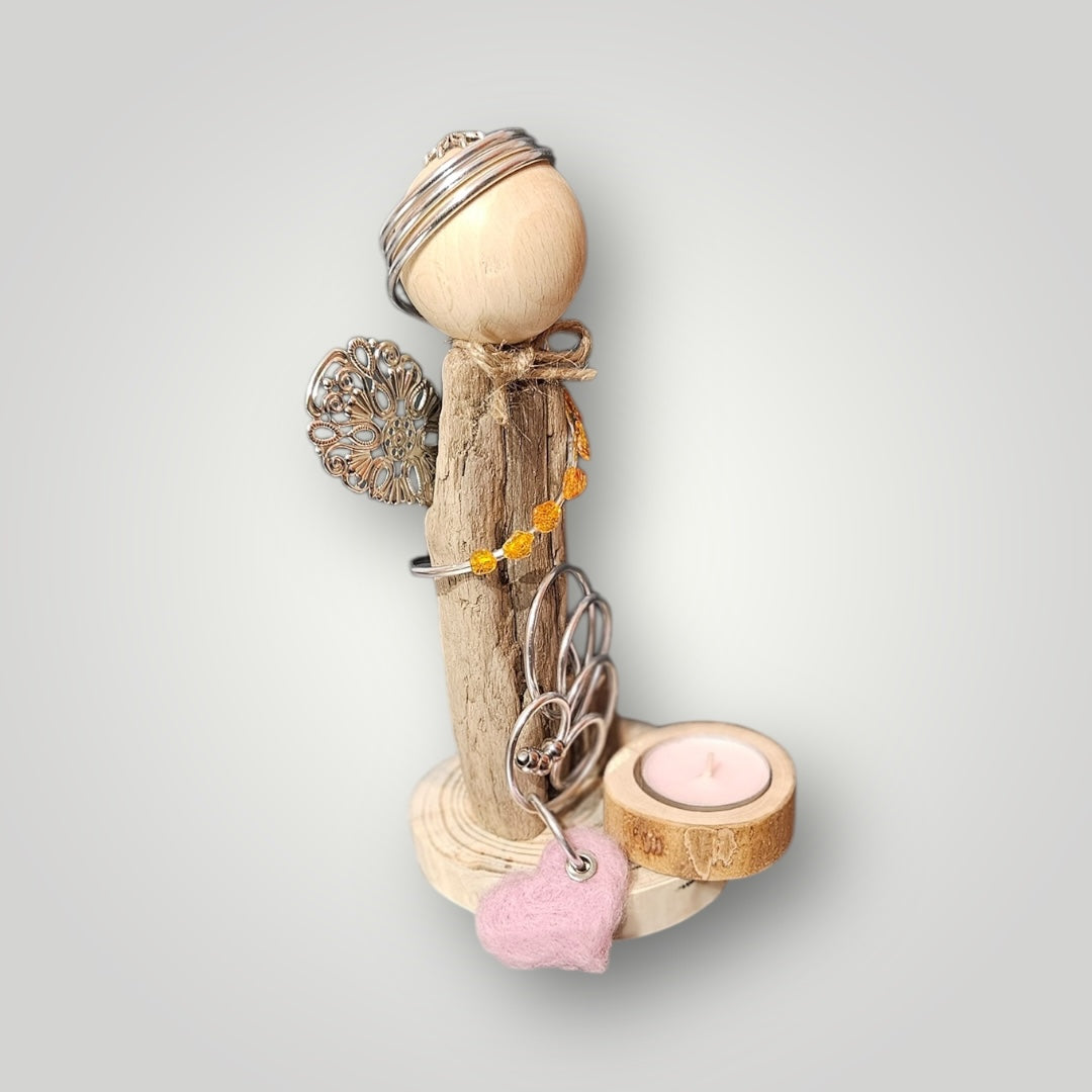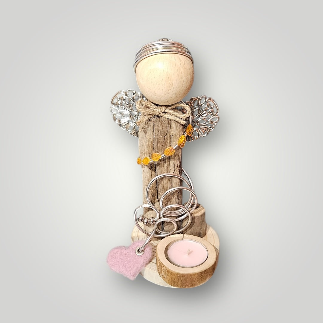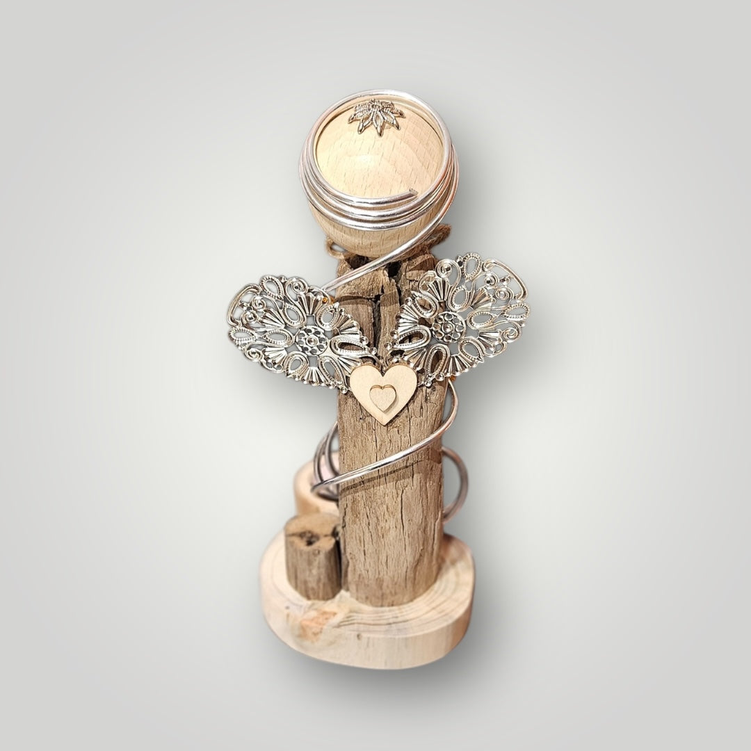Dieser liebevoll handgefertigte Engel bringt Glück und positive Energie in dein Zuhause. Jeder Engel wird aus natürlichen Materialien wie Holz, Metall und Treibholz individuell gestaltet, wodurch jeder ein Unikat ist. Die Flügel bestehen aus filigranem Metall, und der Körper wird durch dekorativen Draht elegant umrahmt. Das Treibholz verleiht dem Engel einen rustikalen und einzigartigen Charme. Ein kleines Herz, Stern oder Kleeblatt in verschiedenen Farben aus Filz sorgt für eine farbenfrohe, persönliche Note. Die Engel stehen auf einer stabilen Holzscheibe und eignen sich ideal als Deko-Element für Regale, Tische oder Fensterbänke.