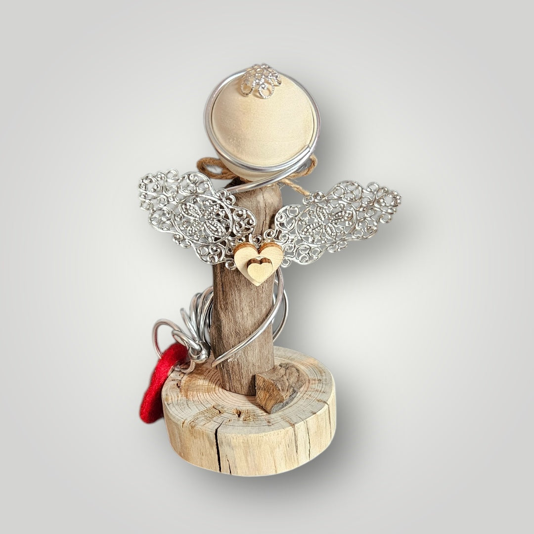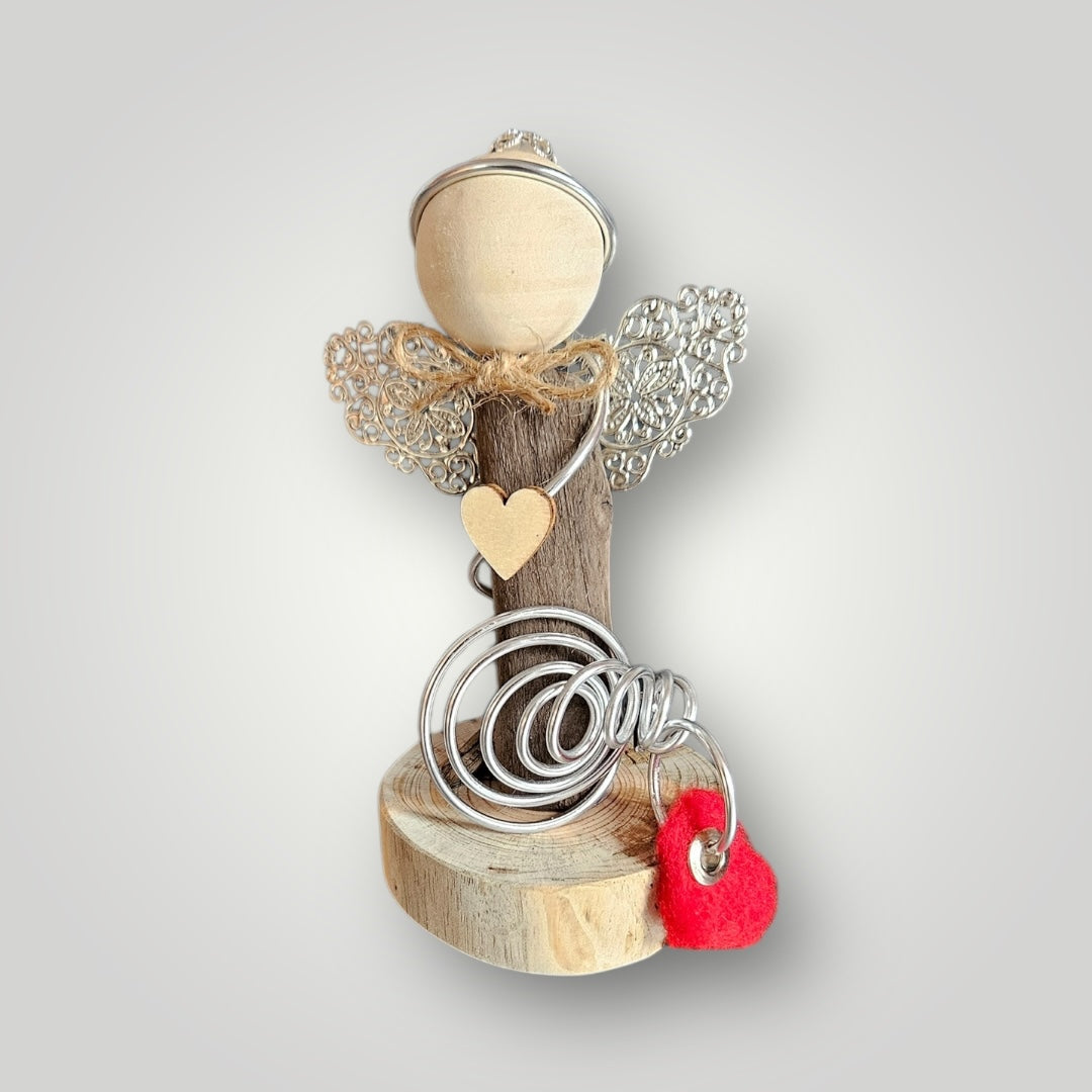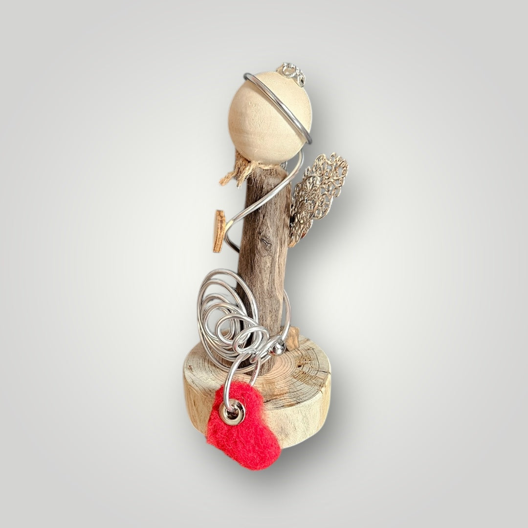 Dieser liebevoll handgefertigte Engel bringt Glück und positive Energie in dein Zuhause. Jeder Engel wird aus natürlichen Materialien wie Holz, Metall und Treibholz individuell gestaltet, wodurch jeder ein Unikat ist. Die Flügel bestehen aus filigranem Metall, und der Körper wird durch dekorativen Draht elegant umrahmt. Das Treibholz verleiht dem Engel einen rustikalen und einzigartigen Charme. Ein kleines Herz, Stern oder Kleeblatt in verschiedenen Farben aus Filz sorgt für eine farbenfrohe, persönliche Note. Die Engel stehen auf einer stabilen Holzscheibe und eignen sich ideal als Deko-Element für Regale, Tische oder Fensterbänke.