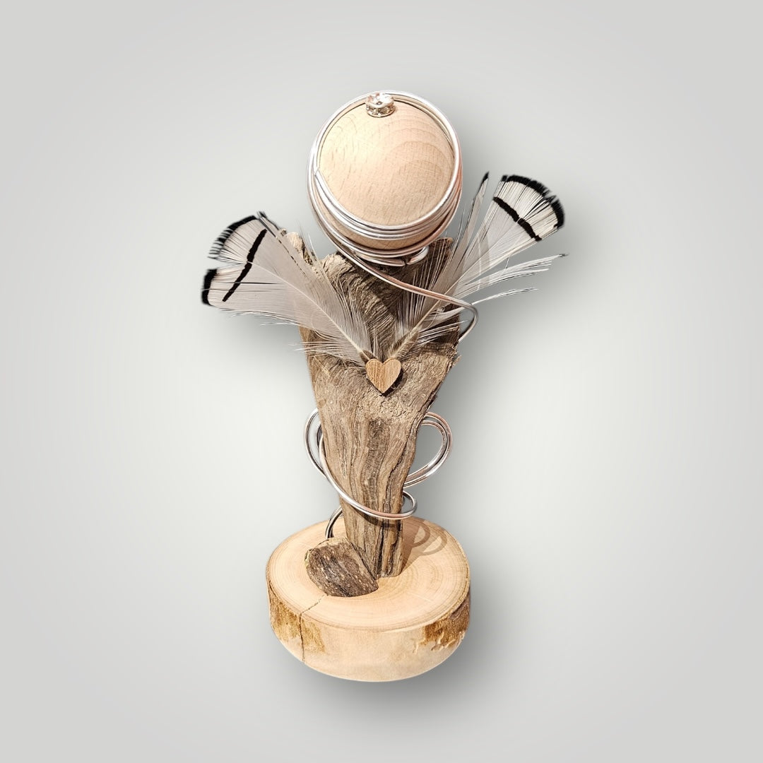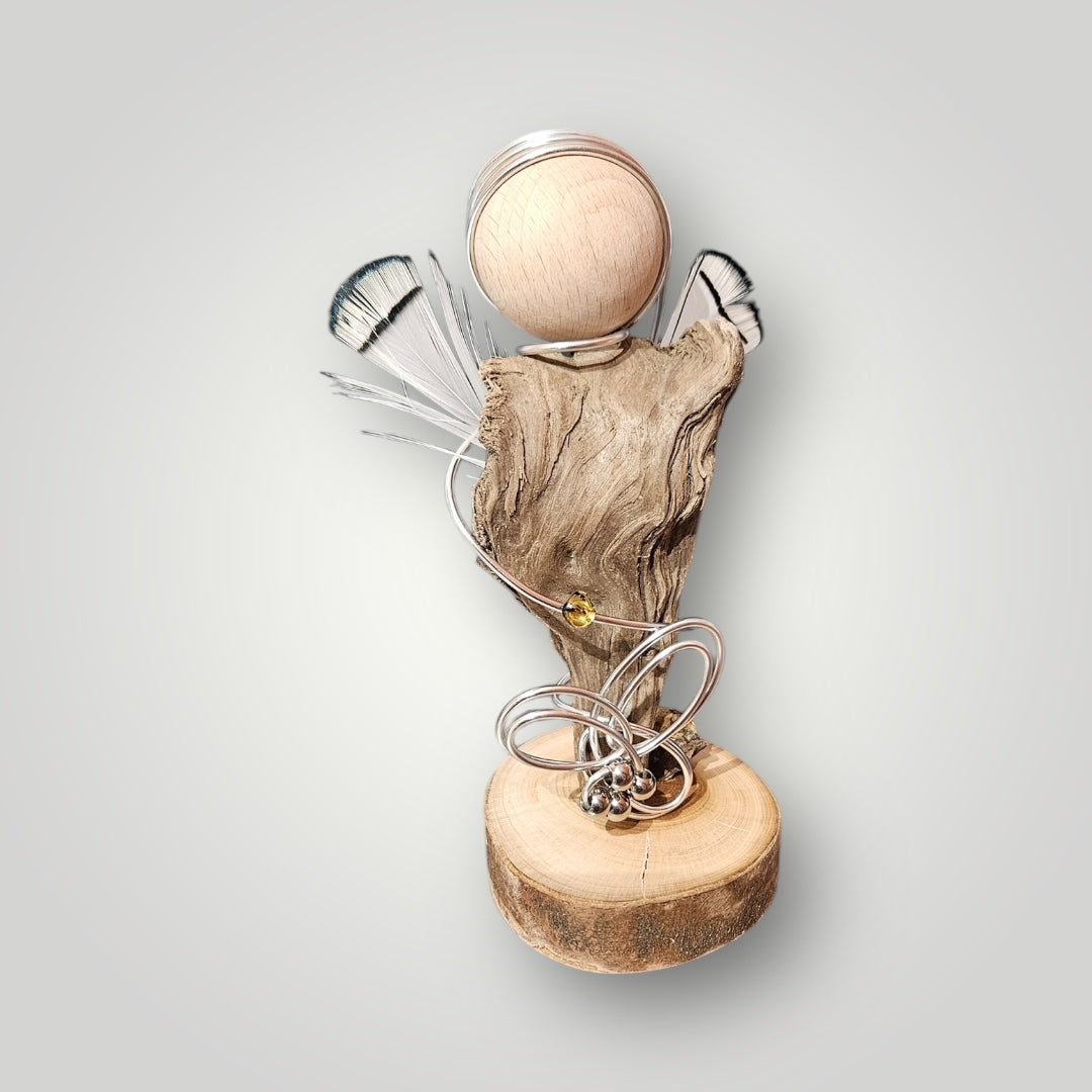 Dieser liebevoll handgefertigte Engel bringt Glück und positive Energie in dein Zuhause. Jeder Engel wird aus natürlichen Materialien wie Holz, Metall und Treibholz individuell gestaltet, wodurch jeder ein Unikat ist. Die Flügel bestehen aus filigranem Metall, und der Körper wird durch dekorativen Draht elegant umrahmt. Das Treibholz verleiht dem Engel einen rustikalen und einzigartigen Charme. Ein kleines Herz, Stern oder Kleeblatt in verschiedenen Farben aus Filz sorgt für eine farbenfrohe, persönliche Note. Die Engel stehen auf einer stabilen Holzscheibe und eignen sich ideal als Deko-Element für Regale, Tische oder Fensterbänke.