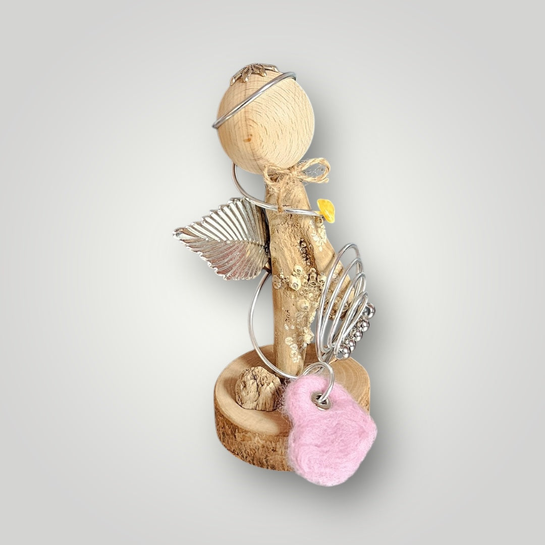 Dieser liebevoll handgefertigte Engel bringt Glück und positive Energie in dein Zuhause. Jeder Engel wird aus natürlichen Materialien wie Holz, Metall und Treibholz individuell gestaltet, wodurch jeder ein Unikat ist. Die Flügel bestehen aus filigranem Metall, und der Körper wird durch dekorativen Draht elegant umrahmt. Das Treibholz verleiht dem Engel einen rustikalen und einzigartigen Charme. Ein kleines Herz, Stern oder Kleeblatt in verschiedenen Farben aus Filz sorgt für eine farbenfrohe, persönliche Note. Die Engel stehen auf einer stabilen Holzscheibe und eignen sich ideal als Deko-Element für Regale, Tische oder Fensterbänke.