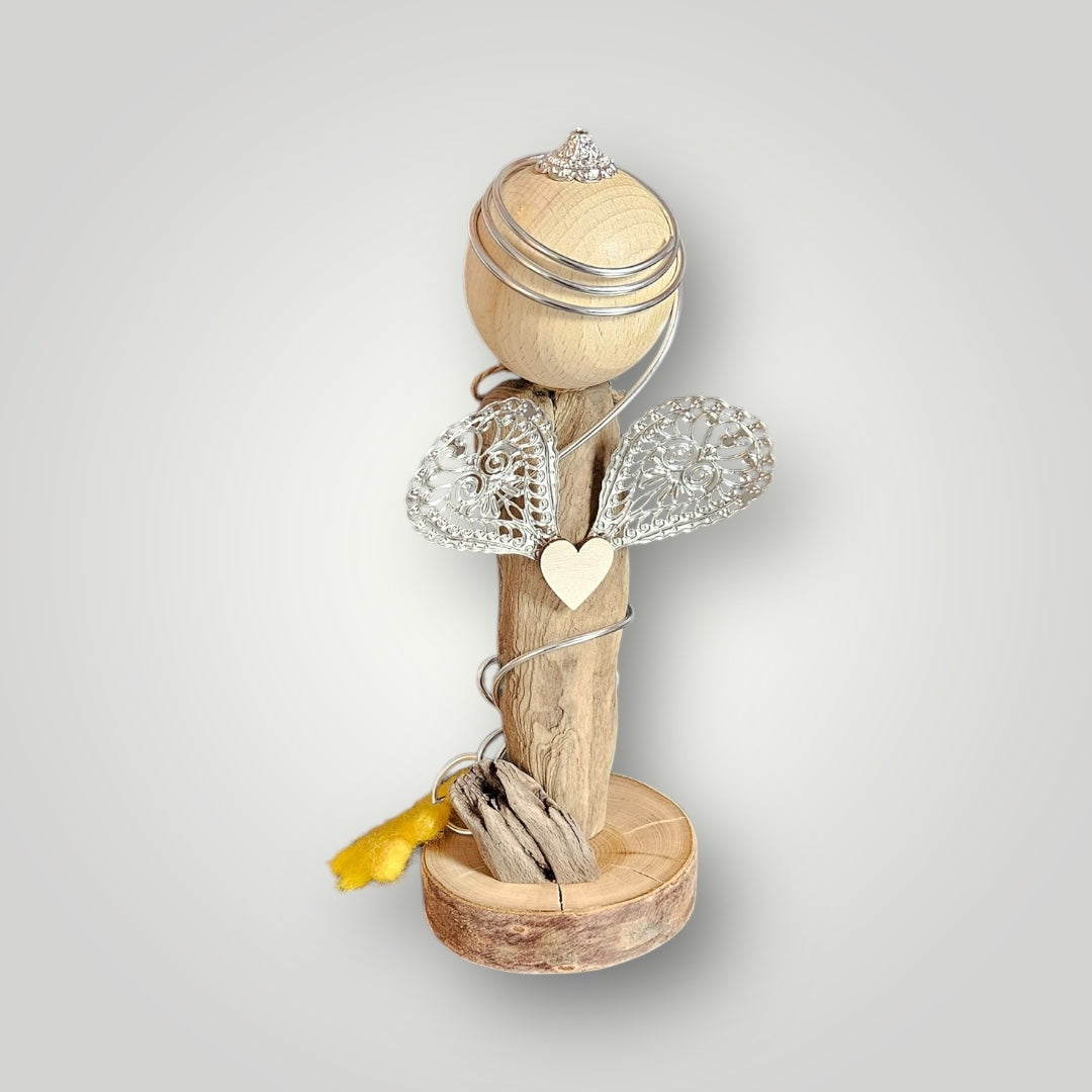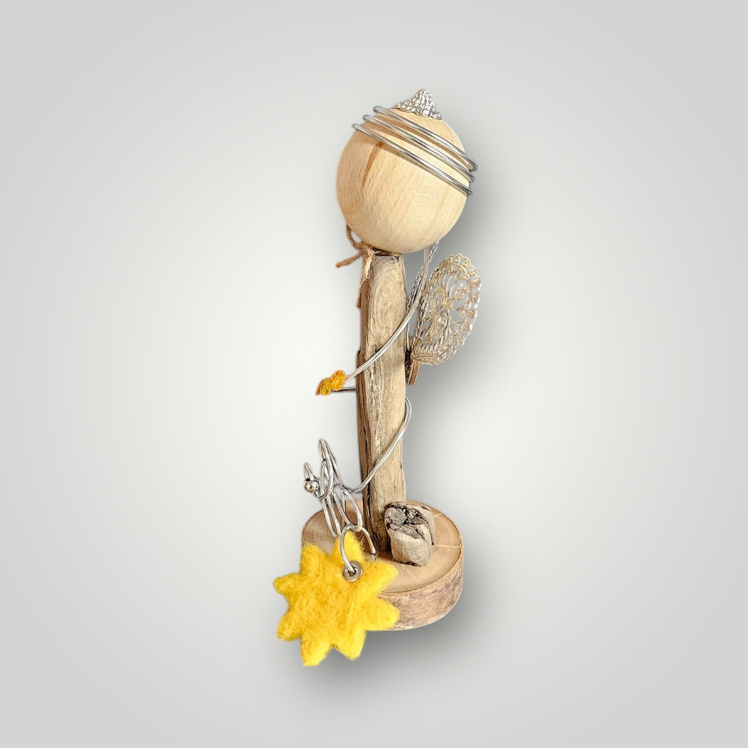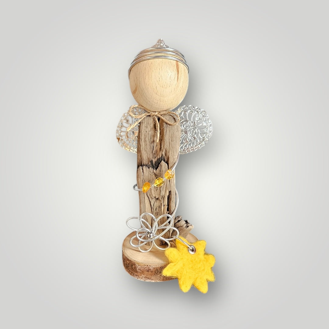 Dieser liebevoll handgefertigte Engel bringt Glück und positive Energie in dein Zuhause. Jeder Engel wird aus natürlichen Materialien wie Holz, Metall und Treibholz individuell gestaltet, wodurch jeder ein Unikat ist. Die Flügel bestehen aus filigranem Metall, und der Körper wird durch dekorativen Draht elegant umrahmt. Das Treibholz verleiht dem Engel einen rustikalen und einzigartigen Charme. Ein kleines Herz, Stern oder Kleeblatt in verschiedenen Farben aus Filz sorgt für eine farbenfrohe, persönliche Note. Die Engel stehen auf einer stabilen Holzscheibe und eignen sich ideal als Deko-Element für Regale, Tische oder Fensterbänke.