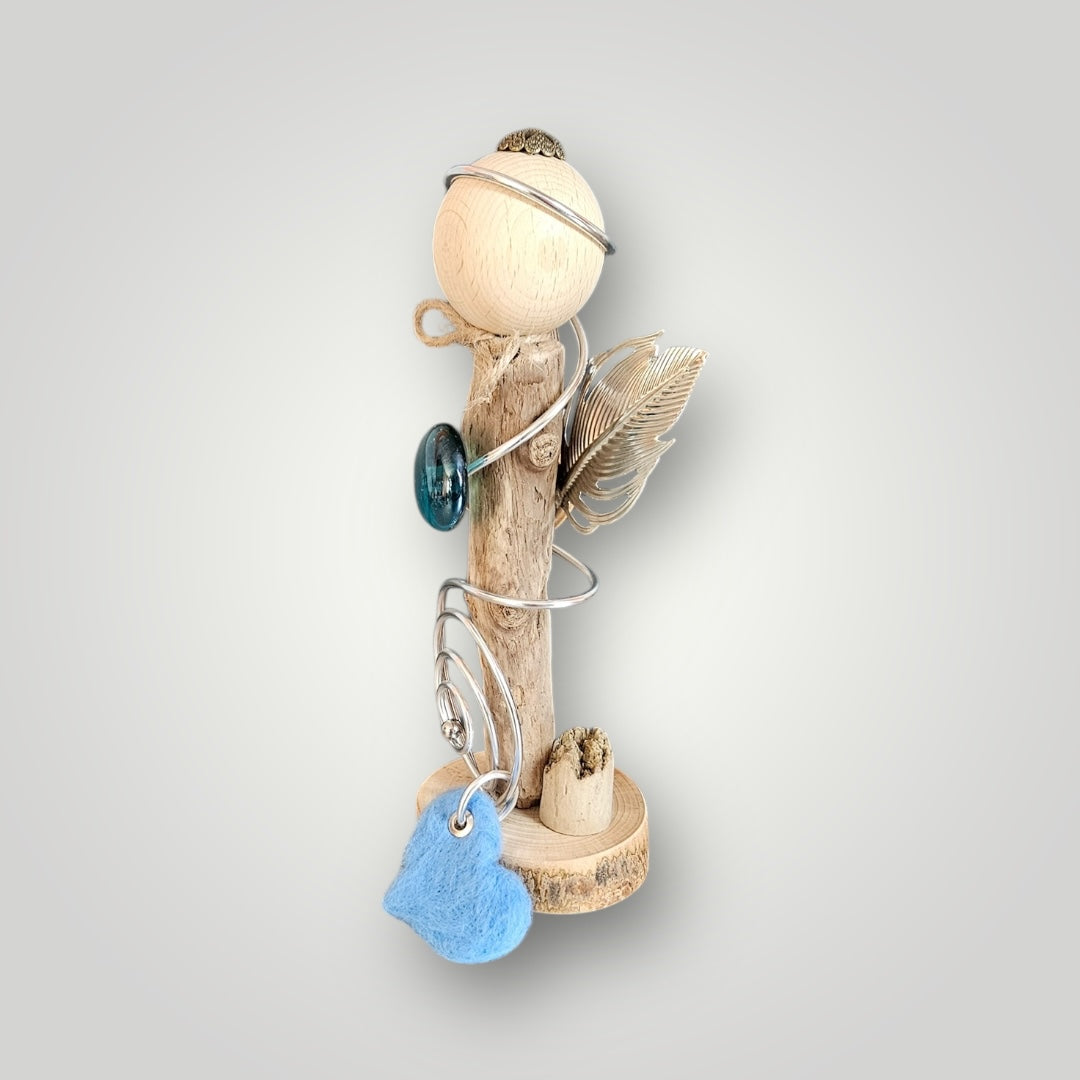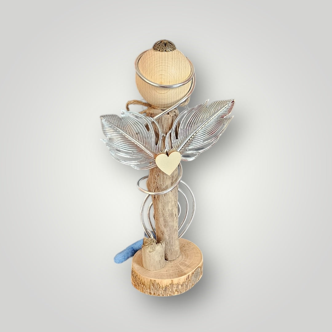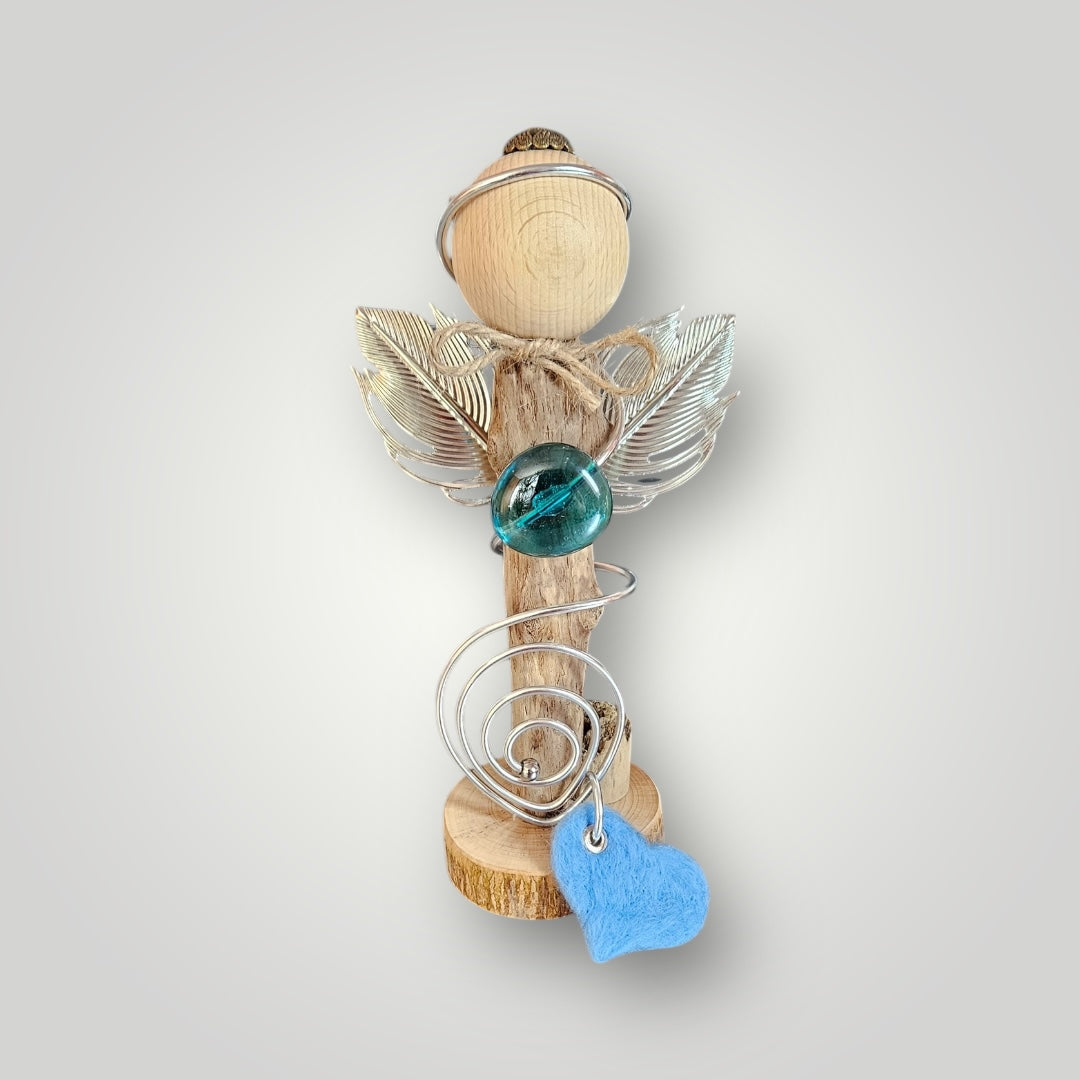 Dieser liebevoll handgefertigte Engel bringt Glück und positive Energie in dein Zuhause. Jeder Engel wird aus natürlichen Materialien wie Holz, Metall und Treibholz individuell gestaltet, wodurch jeder ein Unikat ist. Die Flügel bestehen aus filigranem Metall, und der Körper wird durch dekorativen Draht elegant umrahmt. Das Treibholz verleiht dem Engel einen rustikalen und einzigartigen Charme. Ein kleines Herz, Stern oder Kleeblatt in verschiedenen Farben aus Filz sorgt für eine farbenfrohe, persönliche Note. Die Engel stehen auf einer stabilen Holzscheibe und eignen sich ideal als Deko-Element für Regale, Tische oder Fensterbänke.
