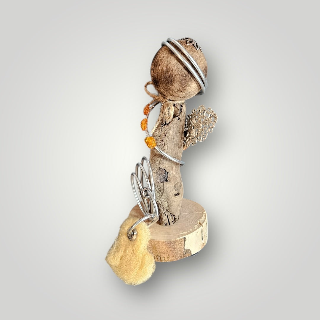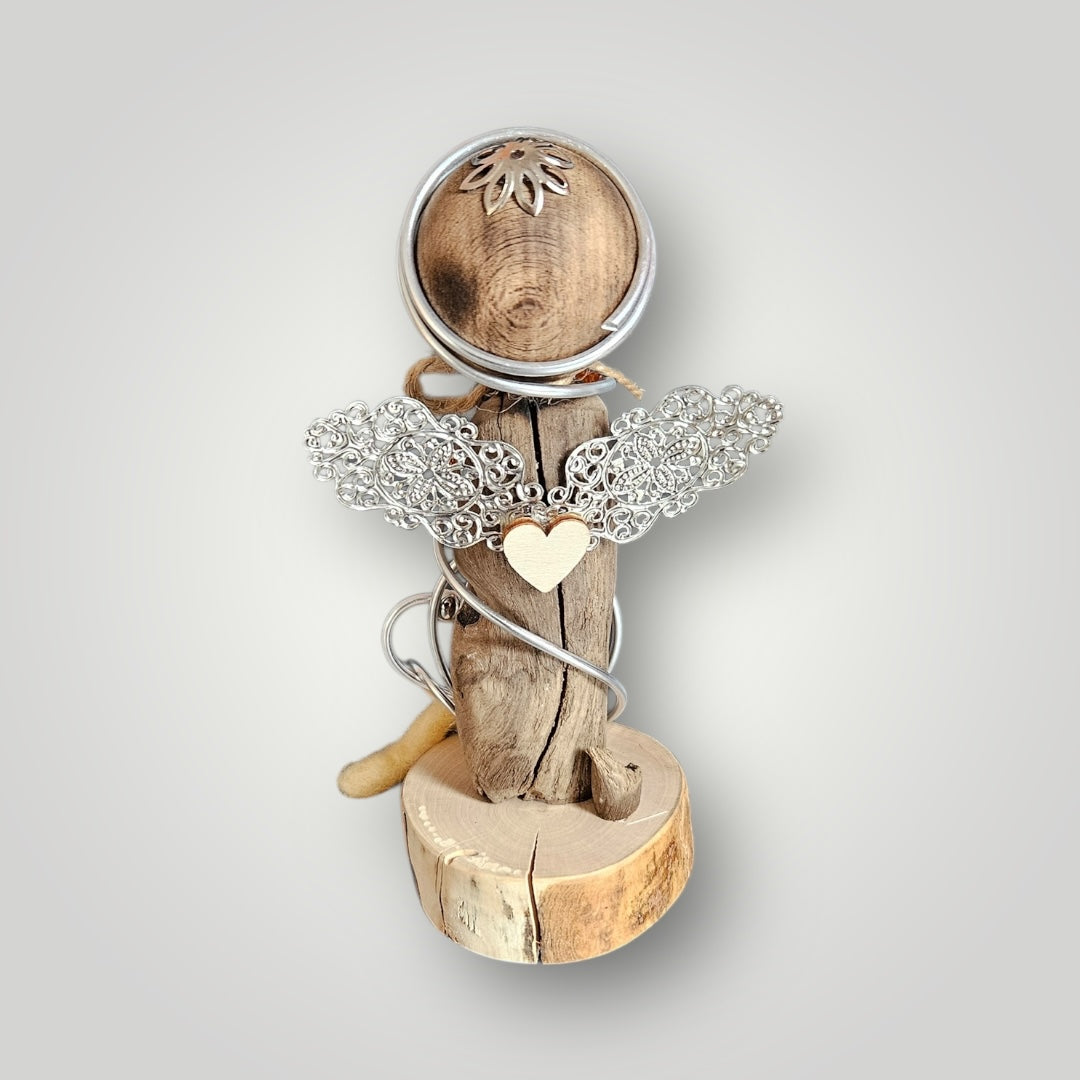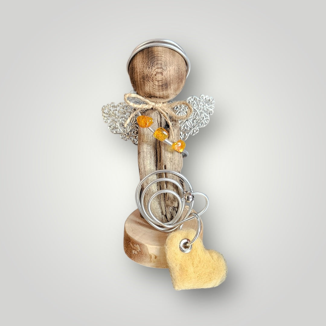 Dieser liebevoll handgefertigte Engel bringt Glück und positive Energie in dein Zuhause. Jeder Engel wird aus natürlichen Materialien wie Holz, Metall und Treibholz individuell gestaltet, wodurch jeder ein Unikat ist. Die Flügel bestehen aus filigranem Metall, und der Körper wird durch dekorativen Draht elegant umrahmt. Das Treibholz verleiht dem Engel einen rustikalen und einzigartigen Charme. Ein kleines Herz, Stern oder Kleeblatt in verschiedenen Farben aus Filz sorgt für eine farbenfrohe, persönliche Note. Die Engel stehen auf einer stabilen Holzscheibe und eignen sich ideal als Deko-Element für Regale, Tische oder Fensterbänke.